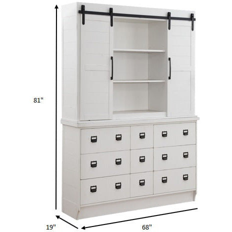 - Create a stunning atmosphere around your dining area with our versatile hutch and buffet. Finished in antique white, this magnificent piece is creatively crafted from poplar wood and MDF to make an impressive statement in any setting. Featuring two barn sliding doors and nine storage compartments with six shelves, the hutch and buffet is complemented by the drawers dovetail French front and back. High design is combined with a transitional style to create this charming piece that is set up to further accentuate the interior of your room.