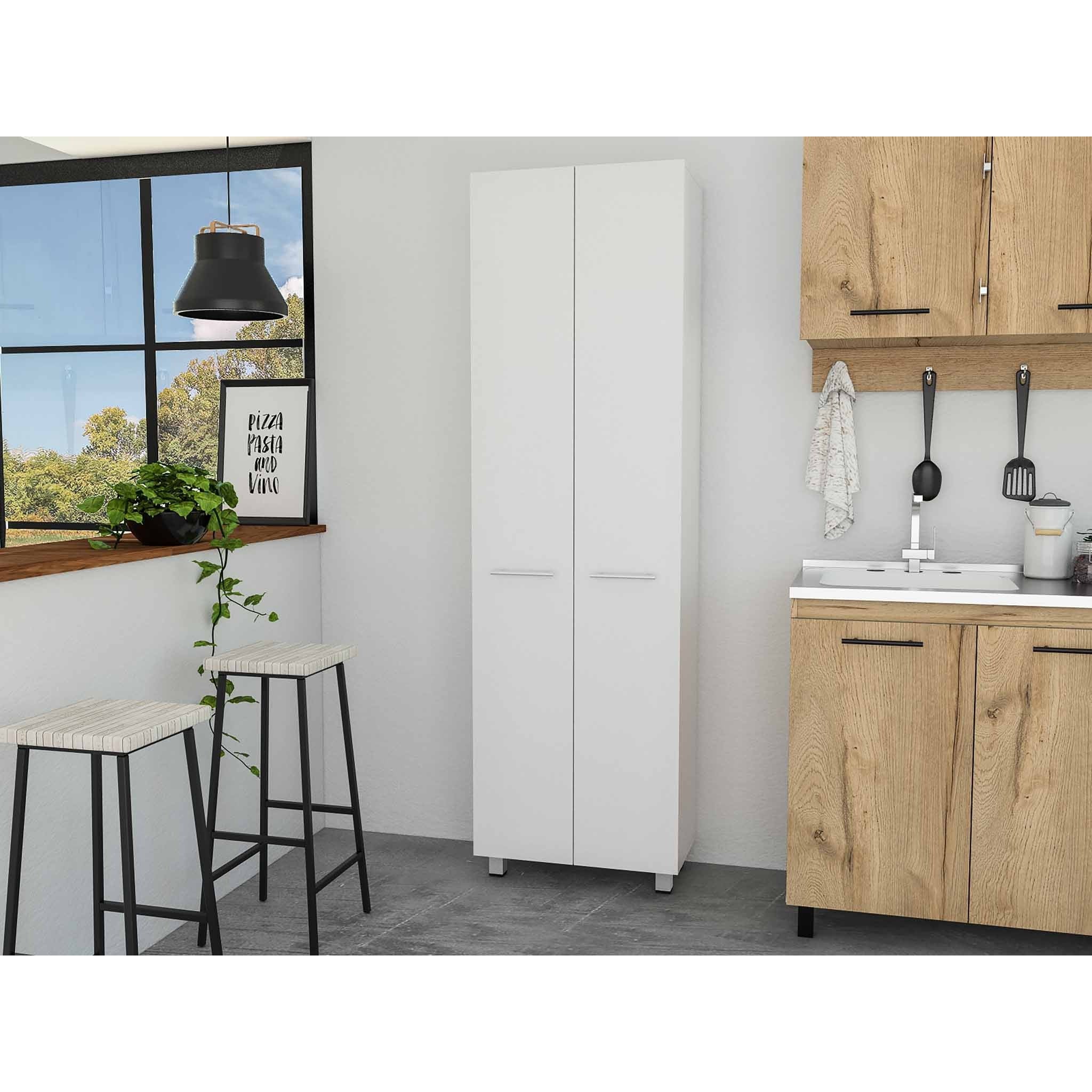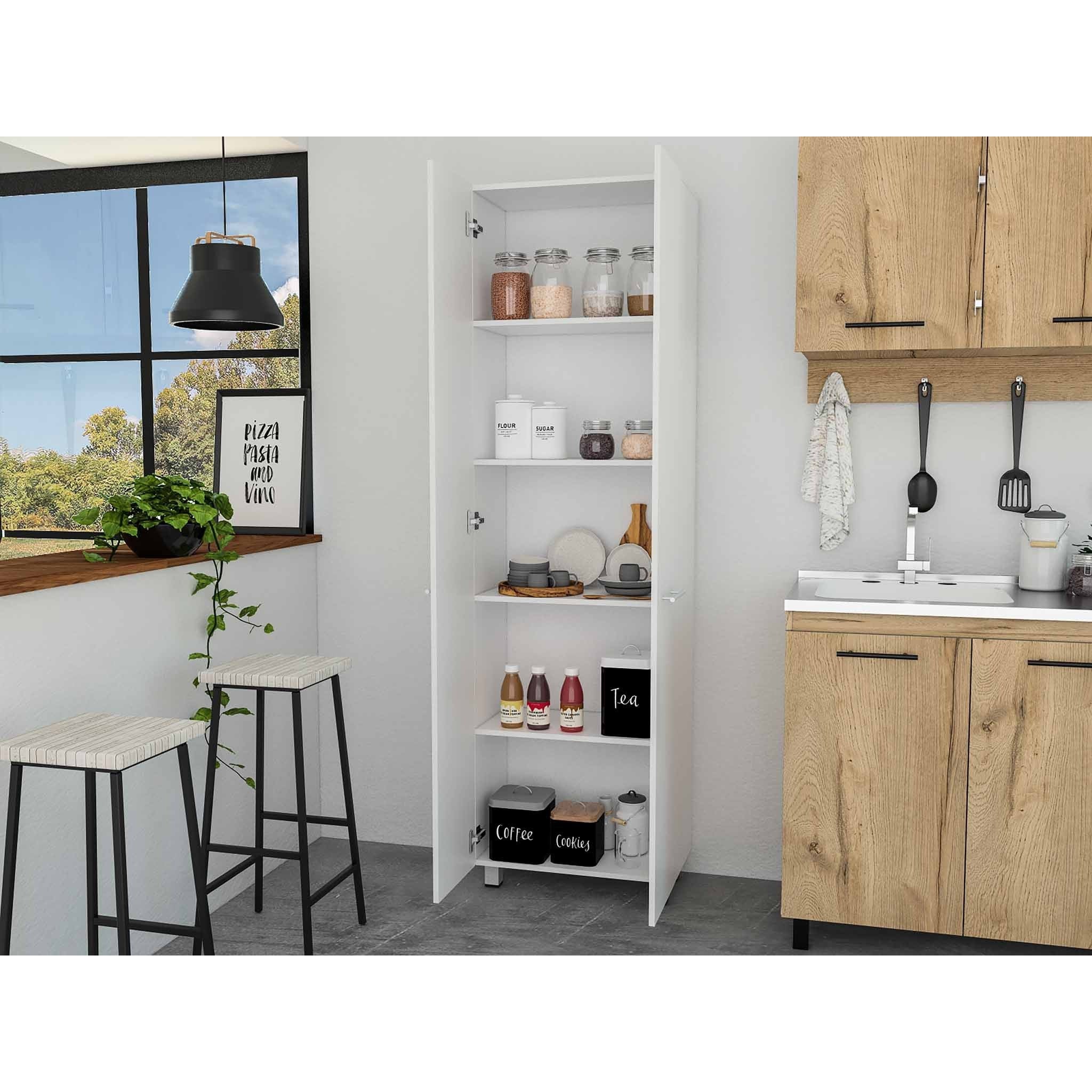 - Modern and super stylish, the Thea White Pantry Cabinet is an ideal piece for kitchen storage. Utilizing its height, you can maximize storage and keep a clutter-free kitchen. It features two cabinet doors with all-metal hardware, five shelves, and adjustable metal legs. With a 14.5" x 23" shelf size, it is perfect for storing small or large kitchen items. Durable and built to last, it is made of premium-quality engineered wood painted in a beautiful white finish. 79" H x 23" W x 14.5" D