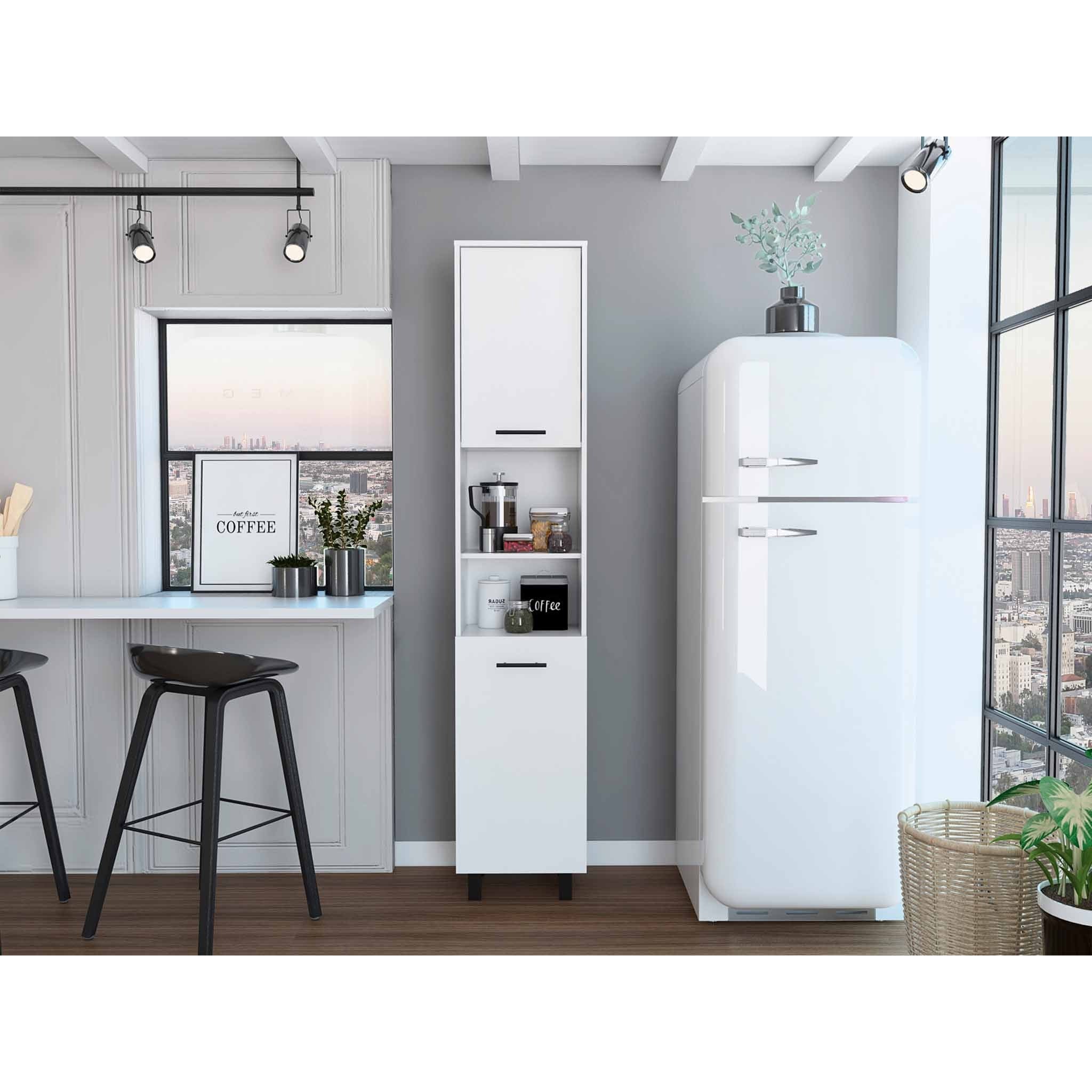 - Elegant and modern, the White Sleek and Tall Pantry Cabinet is an ideal piece for kitchen storage. Utilizing its height and narrow footprint, you can maximize storage and keep a clutter-free kitchen. It features two shelves, two cabinets with all-metal hardware, and adjustable metal legs. It is made of premium-quality engineered wood painted in a beautiful white finish. 79" H x 16" W x 14" D