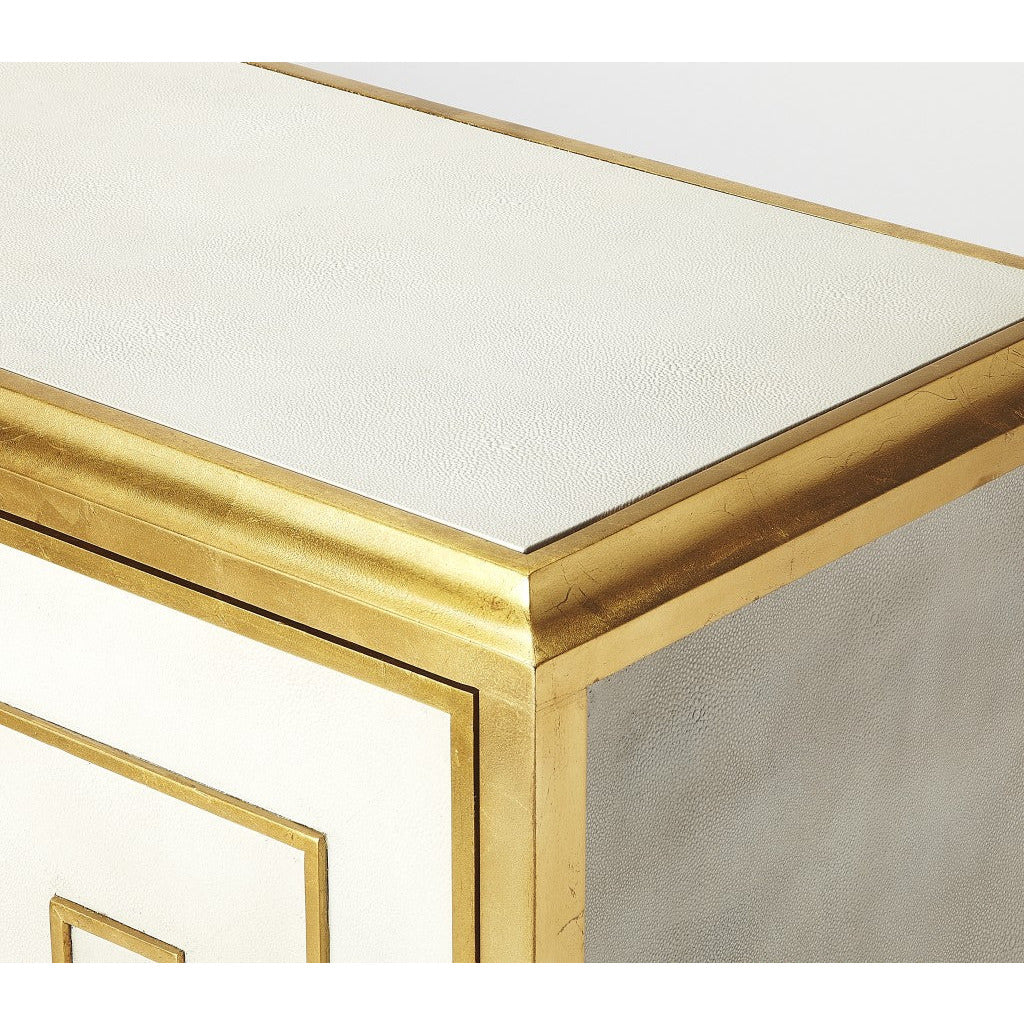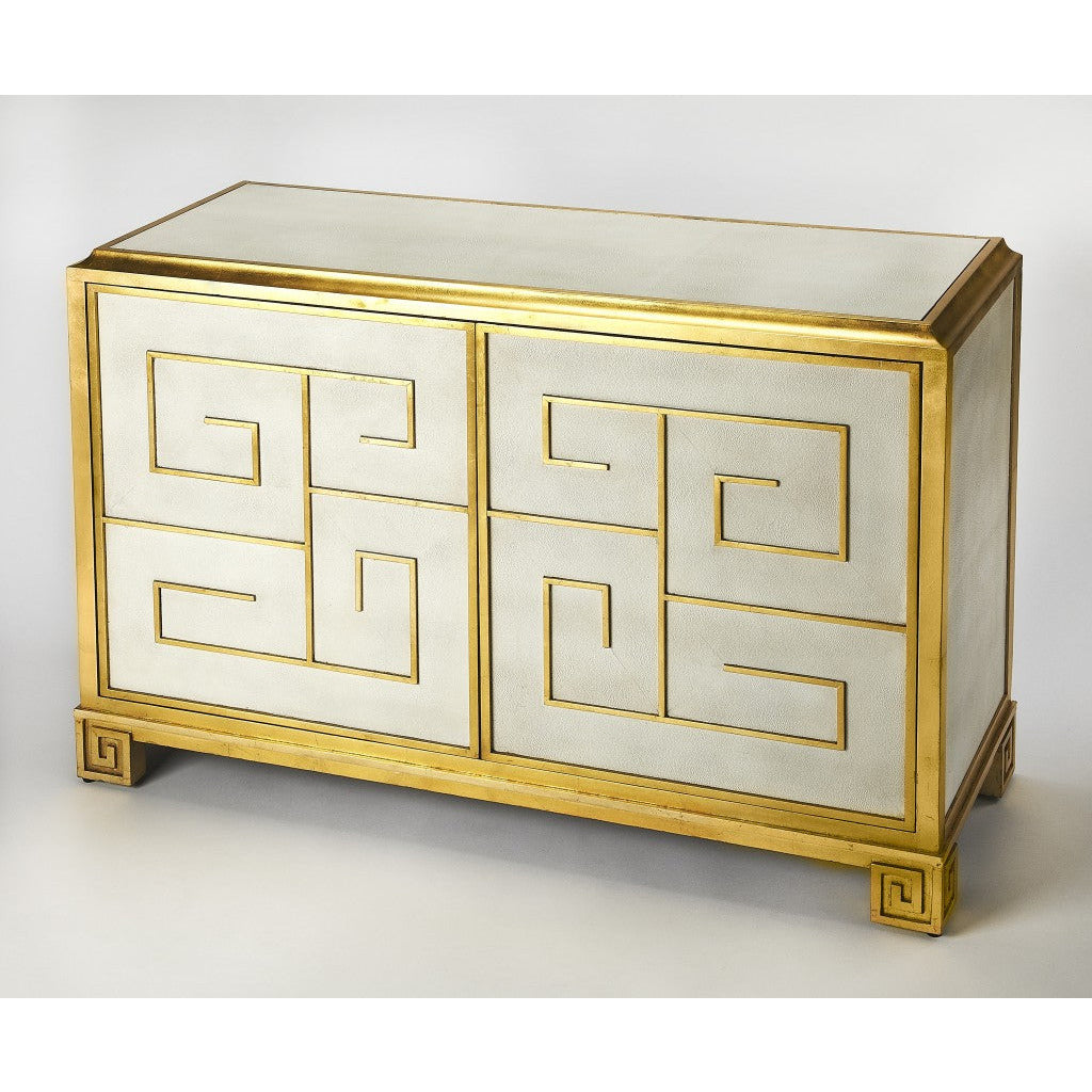 - This preppy cabinet is characterized by its gold, Greek key design that adds to the glam fashion and its white leather upholstered frame creates a soft appeal making this piece the perfect addition to any room in your home. Solid Gemelina wood construction with gold painted Maple veneers.