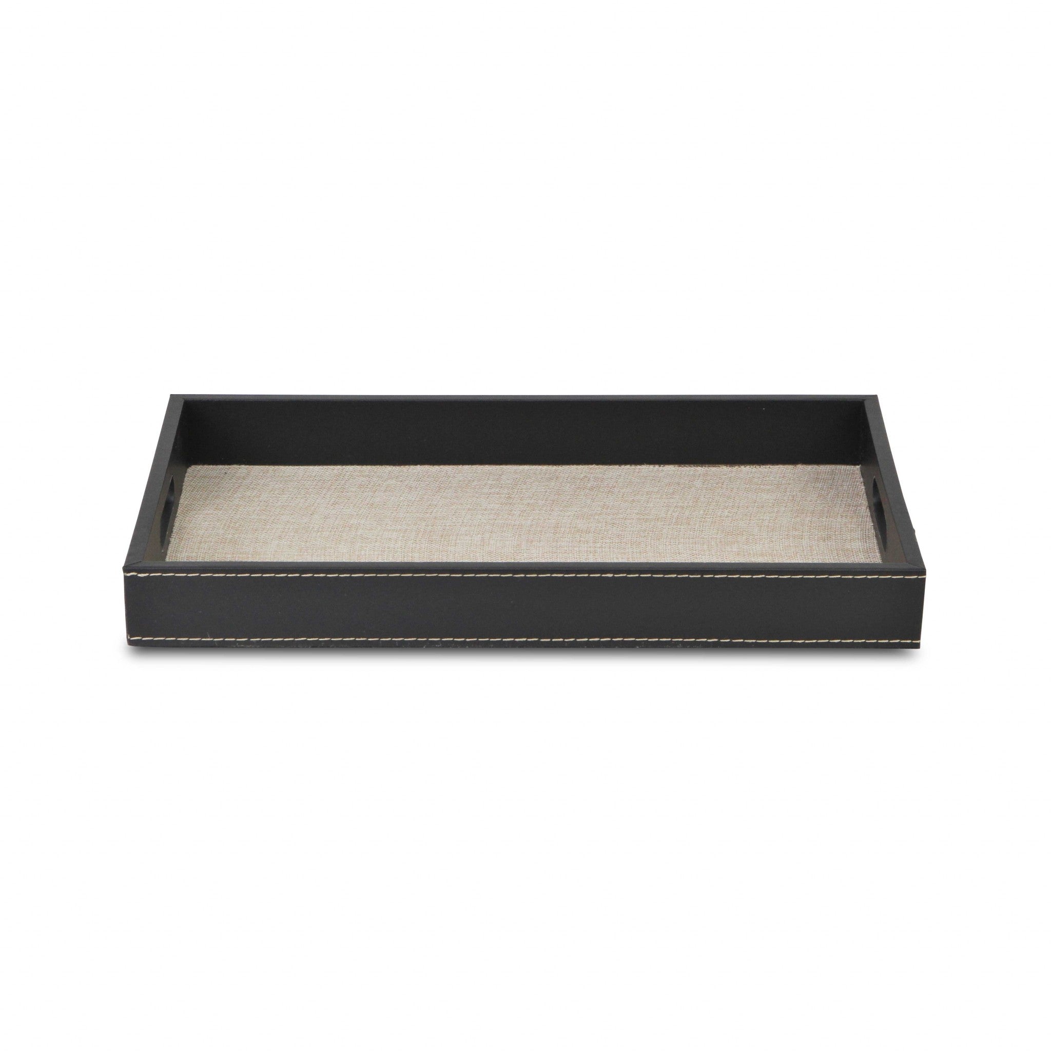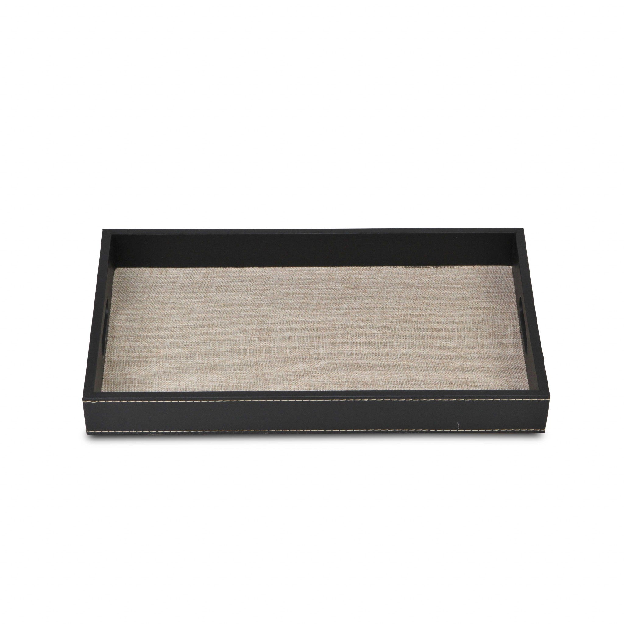 - Make serving even more classy with this Black and Cream Faux Leather and Linen Serving Tray . The tray body is made from solid wood which is covered in black faux leather material that has fresh beige stitching around the top and bottom edges. The bottom of the tray is lined with a linen cloth in a stunning taupe color. There are two handles on either side of the wooden body of the tray that allow you to move it around and carry drinks or snacks on it with ease. Apart form serving, you can also use this tray for storage and unique decor around your home. 1.75" H x 15.75" W x 9.5" D