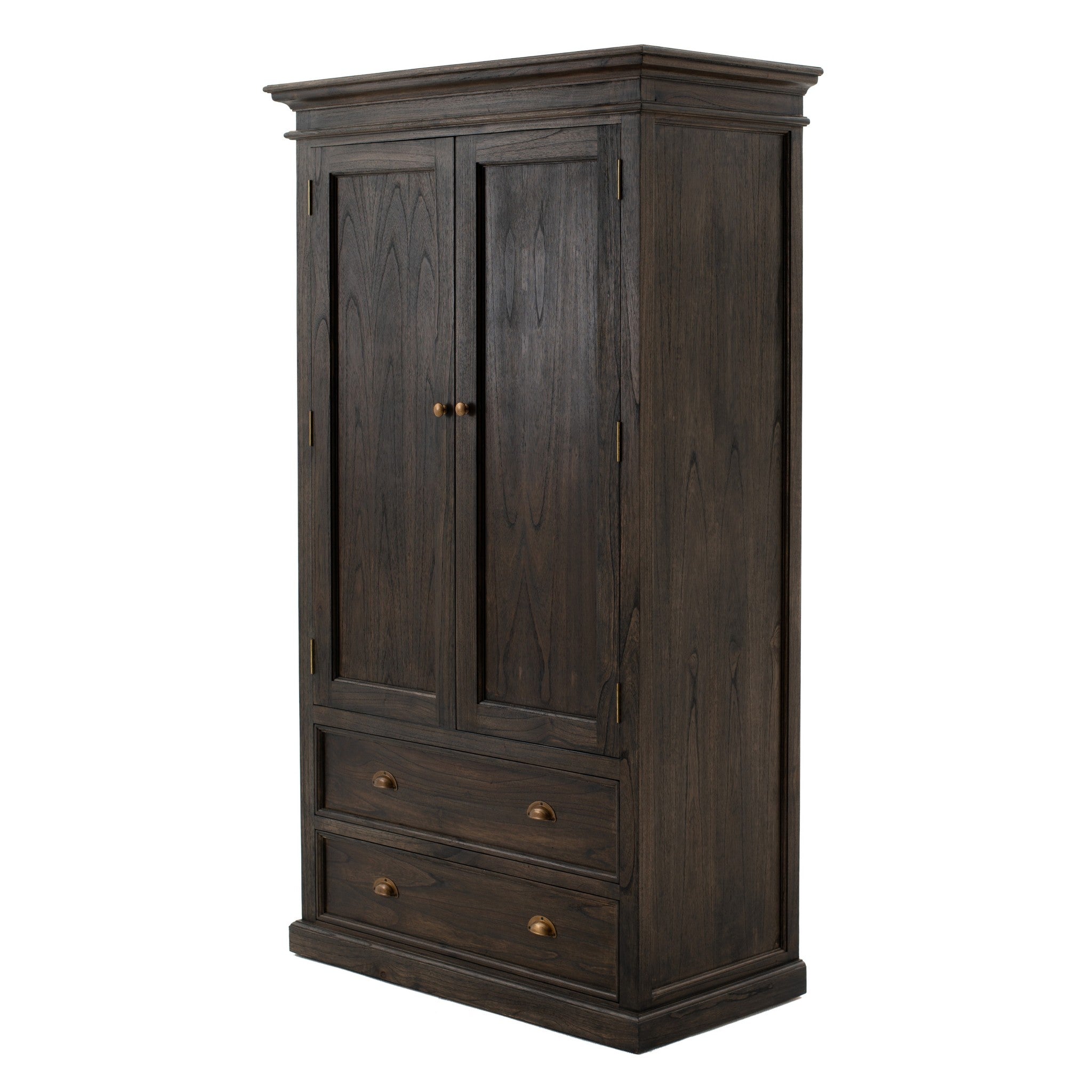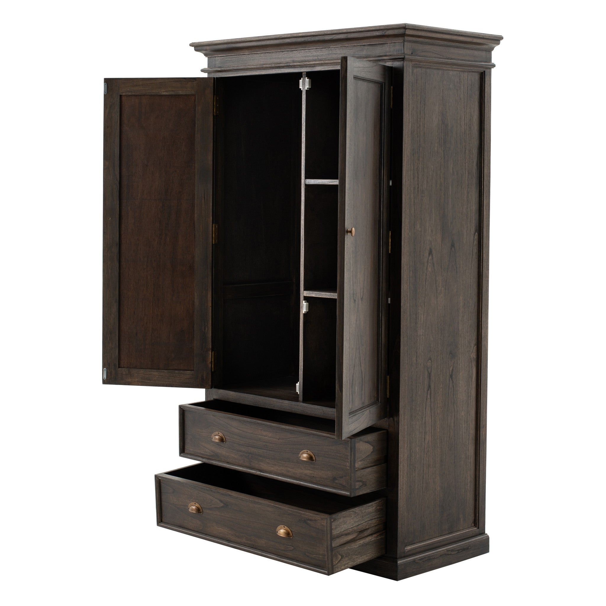 - Exceptionally styled the Black Wash Wardrobe is sophisticated and elegantly designed to solve all your storing needs. Handcrafted from mindi wood with a black wash glaze finish, this wardrobe has a substantial amount of space with shaker style doors that open to reveal three shelves on the right and a hanger storage on the left. Two large drawers with antique brass cup pull handles are accommodated on the lower half of the wardrobe. Crown moldings and sharp edges complete the look of this grand structure. 74.8" x 43.31" x 21.65"