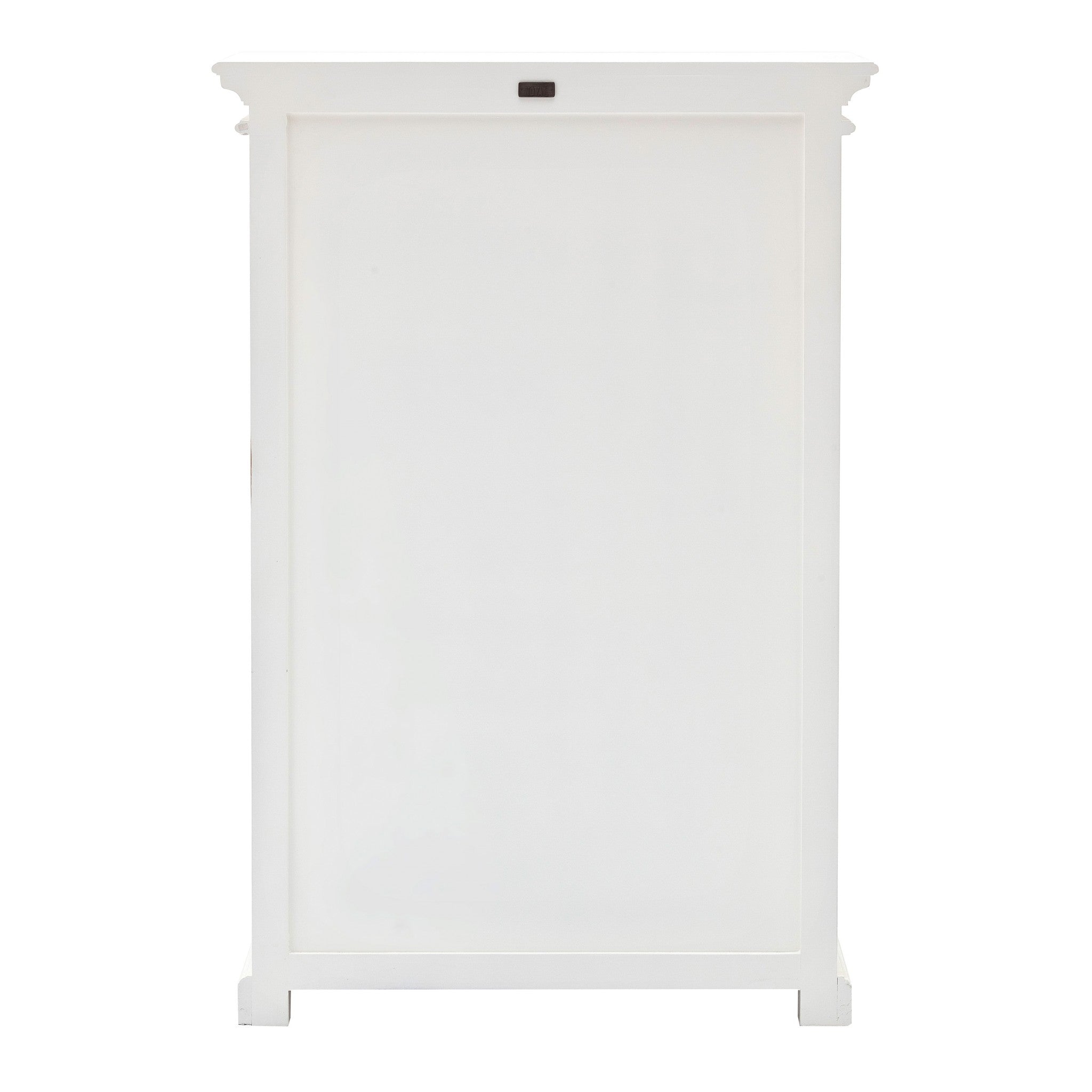 - The Classic White Two Level Storage Cabinet is the ideal choice for a small spaces. This traditional cabinet is crafted from mahogany wood with an all white smooth finish and a matching pair of glass panel see thru doors. Comprising of two levels, the four doors are equipped with antiqued brass knob pull handles and beveled see through glass so that the entire cabinet exuberates a casually elegant and chic persona. Add this great piece in your kitchen, dining area, office or bathroom. With two levels and four shelve areas, the cabinet provides ample storage space for all you basic essentials. Can be great to use a Pantry in the Kitchen or the ultimate in organization in a chic bathroom, hallway, or laundry room. 51.18" x 35.43" x 15.75"
