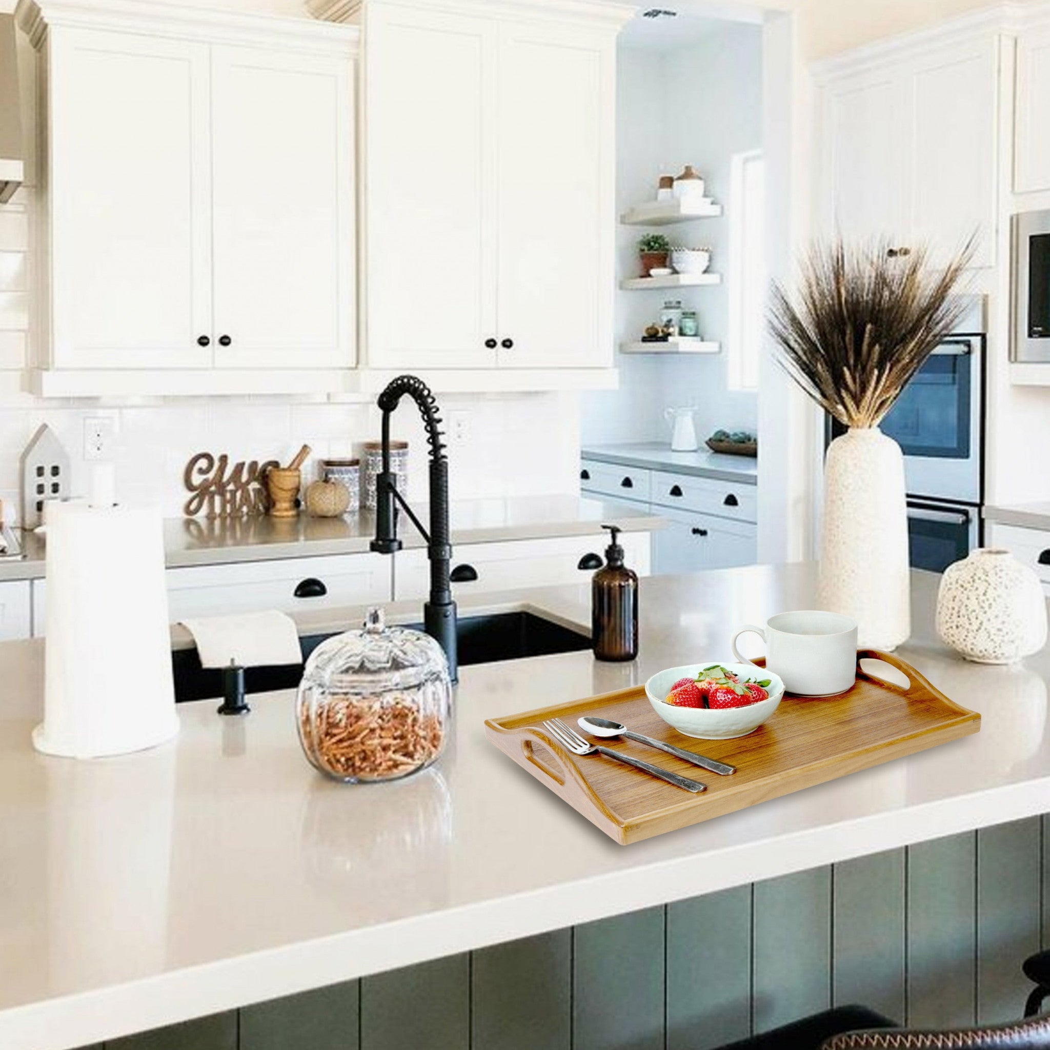 - Convenient and gorgeous, this Designer Solid Teak 19" Serving Tray is all you need for serving and entertaining. This genuine teak wood tray is high quality and looks good enough to sit out all year long. Cut out handles on the side make it easy and comfortable manuver around with the tray, making this the ideal vehichle for breakfast in bed! Teak is naturally water and mold resistant making it a great option for use indoors or outdoors. 1.9" x 18.8" x 12.3".