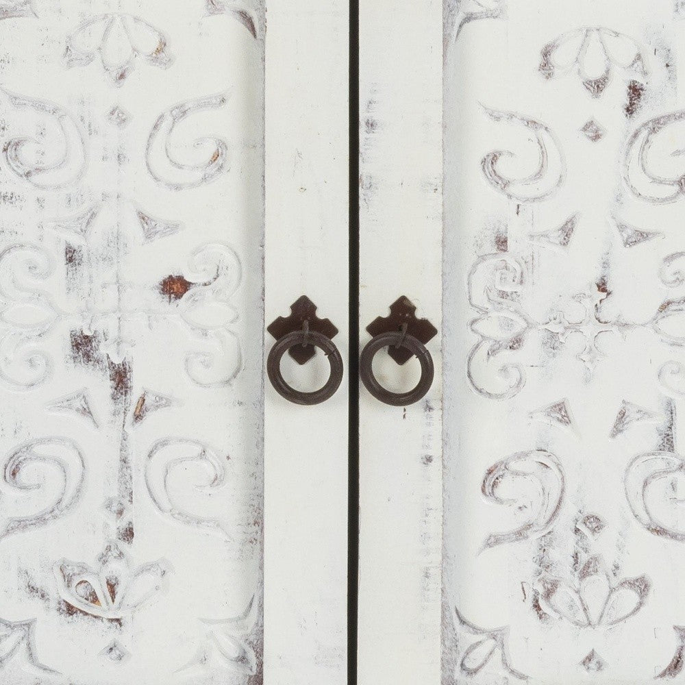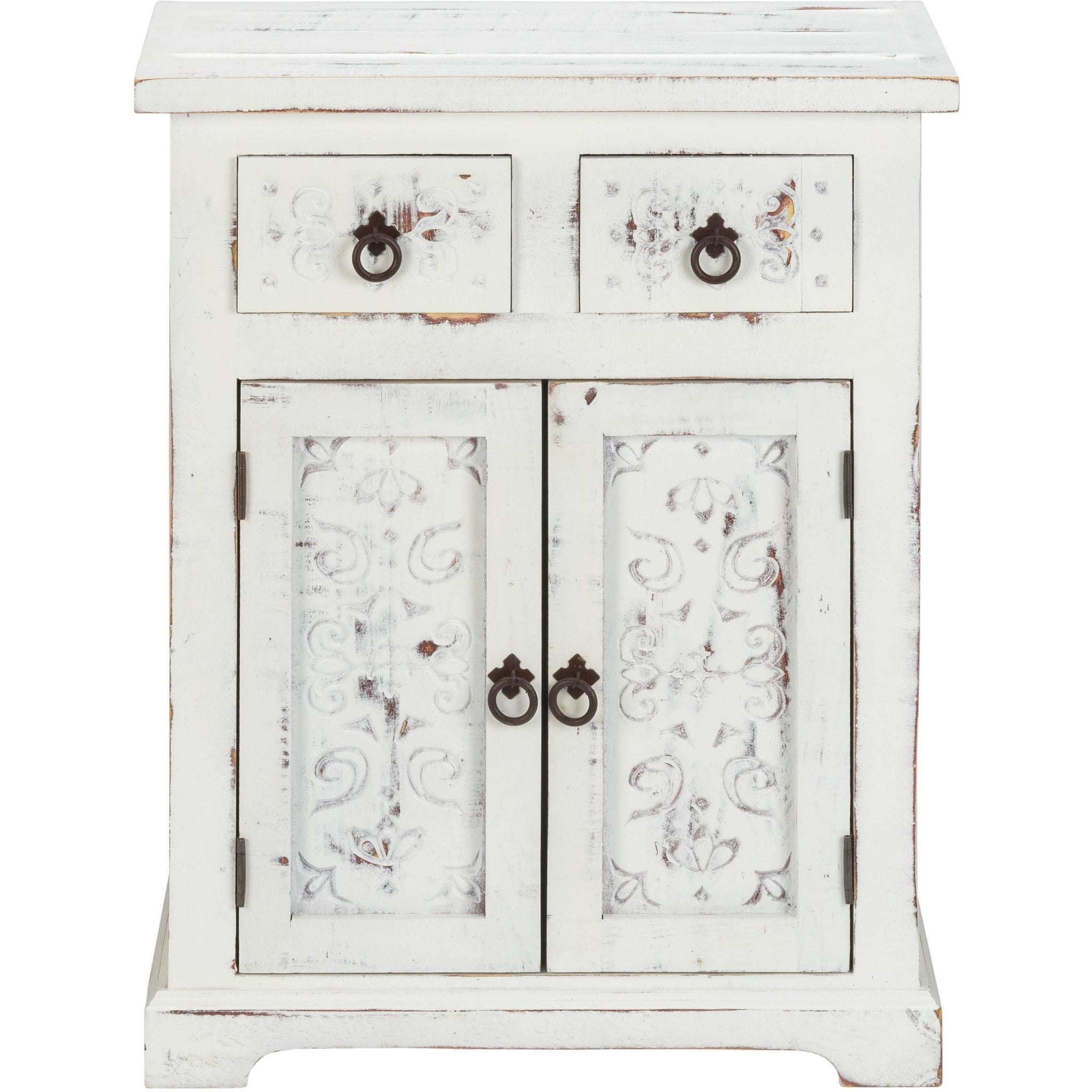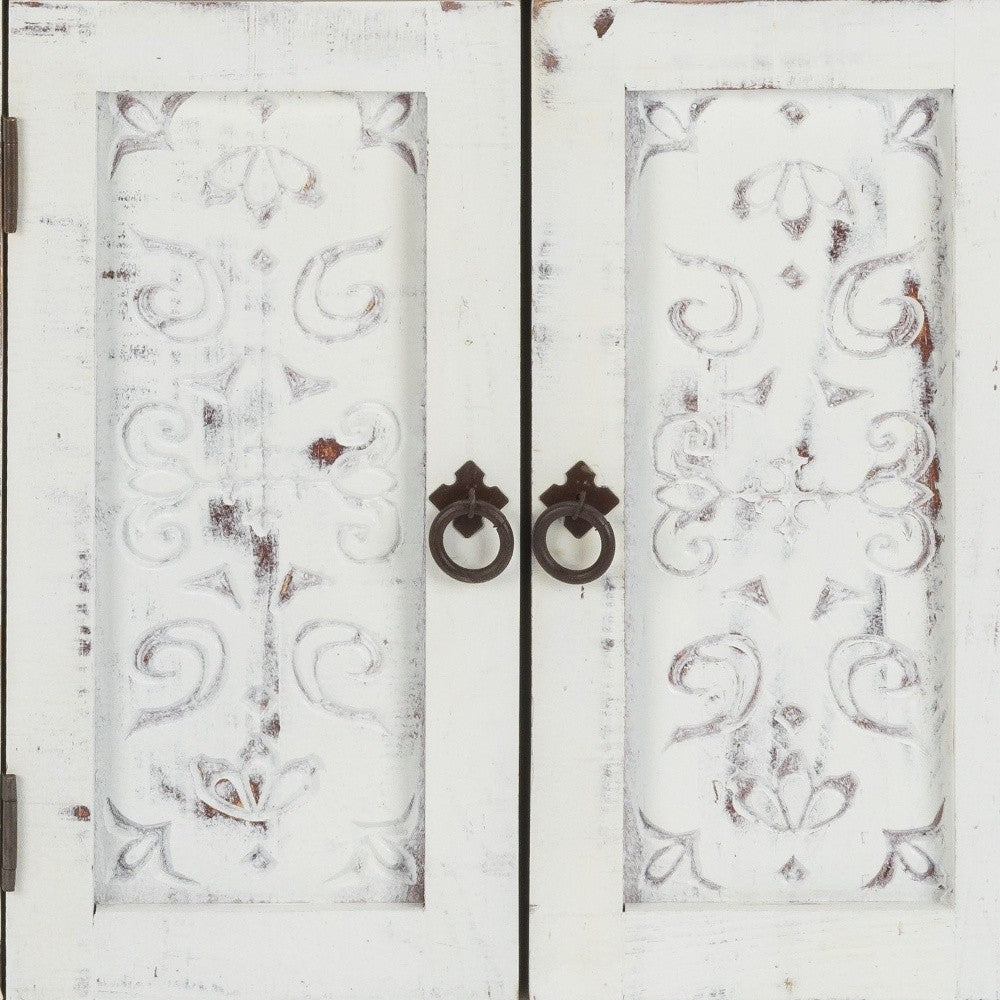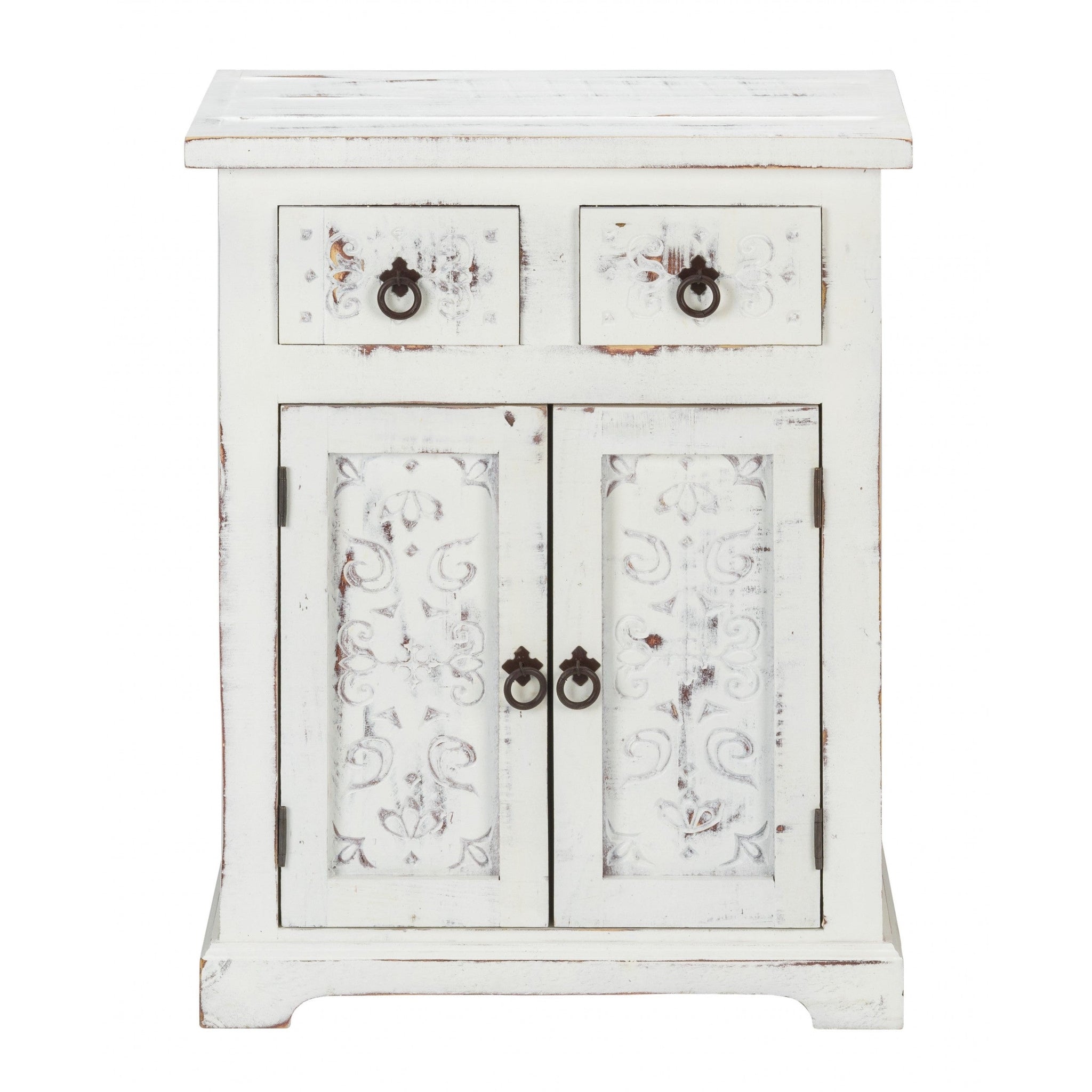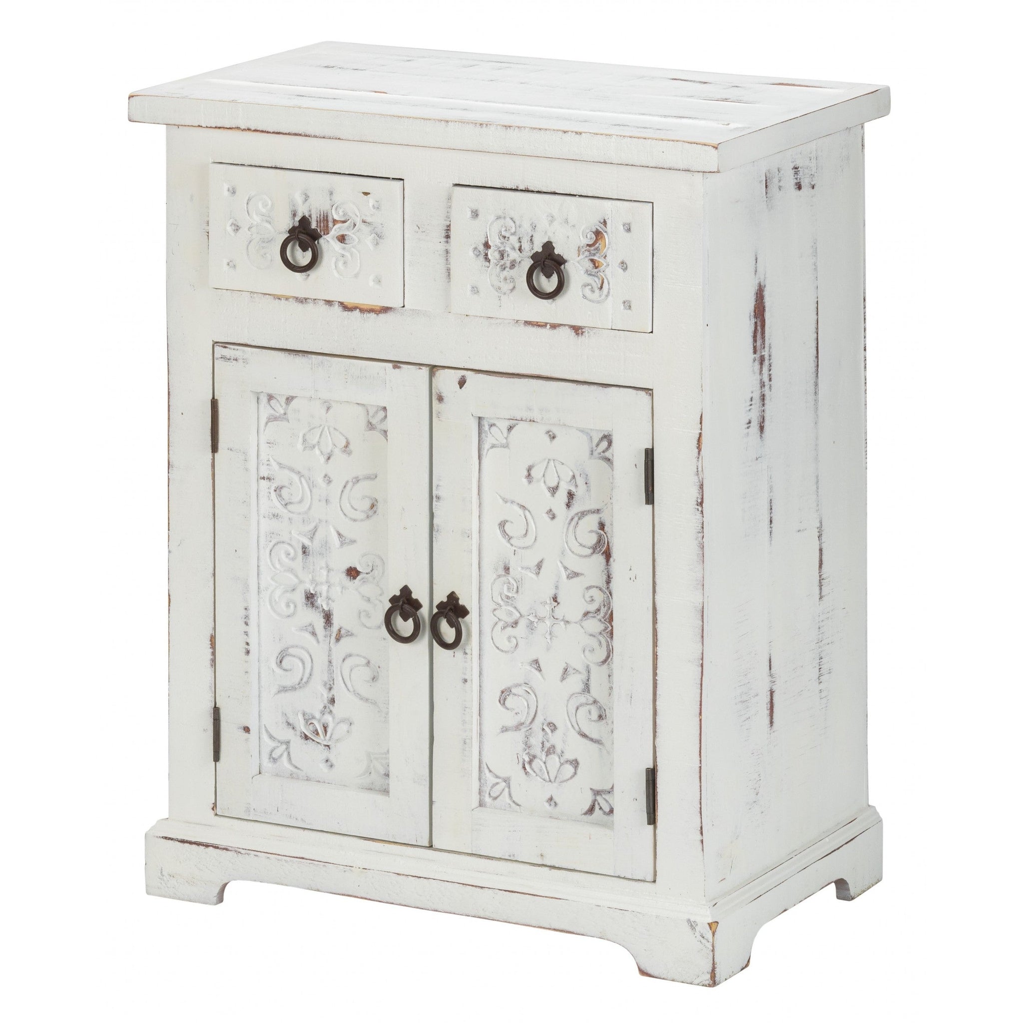 - Unconventionally artistic, the Distressed White Wooden Carved 2 Door and 2 Drawer Cabinet adds some character to any room in your home. Handcrafted from solid wood in a washed out distressed white finish, the cabinet flaunts beautiful hand carving details along the front. It comprises of 2 mini drawers along with a 2 door cabinet providing sufficient storage space. Metal loop pull handles and metal drawer guides with magnetic closure, support the opening and closing of the cupboard/drawers. The Bohemian inspired carvings of this piece emanates a tranquilizing vibe in your home. 30" x 24" x 15"