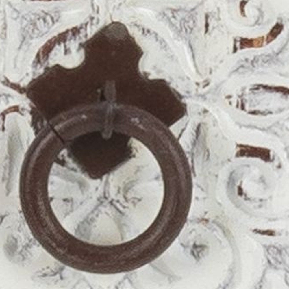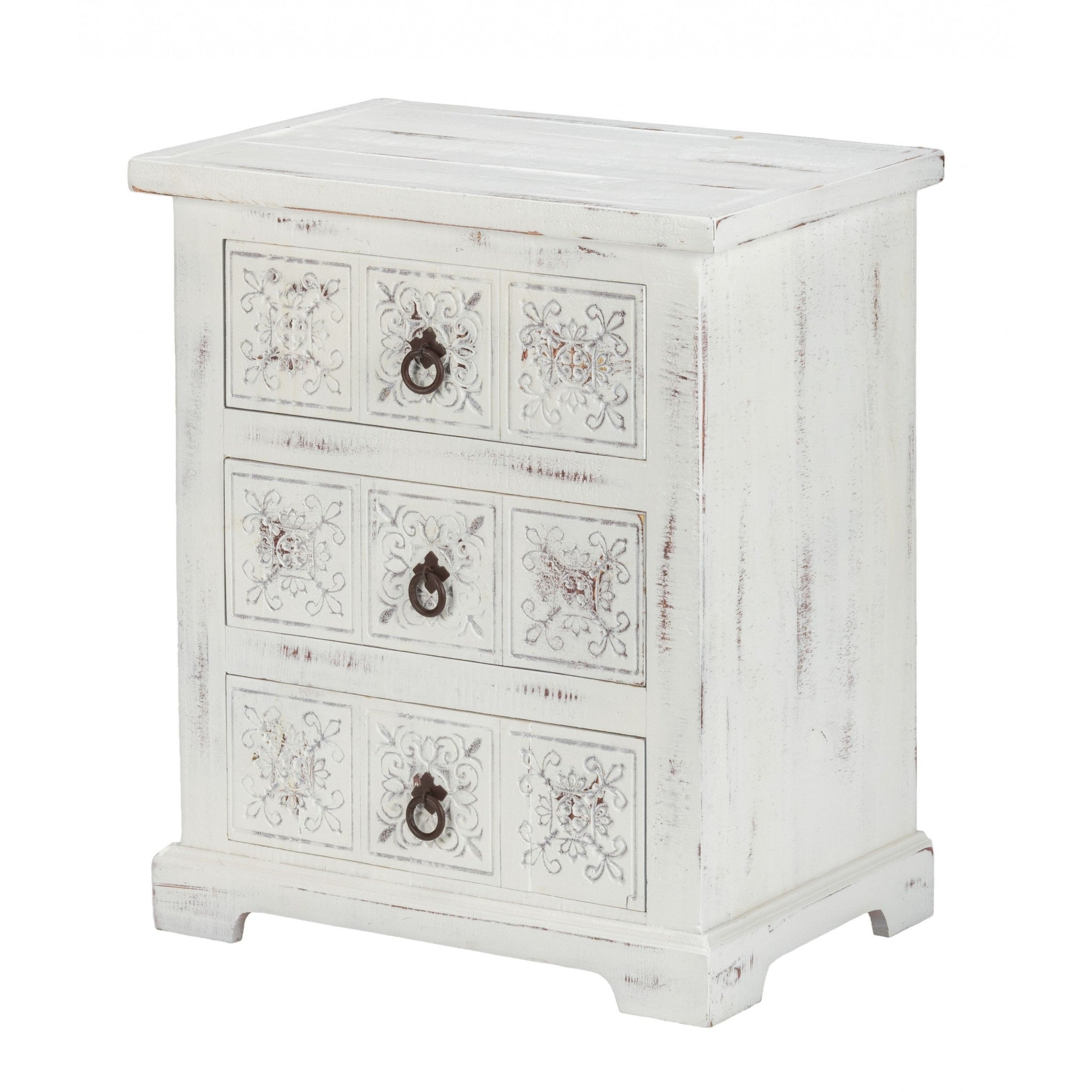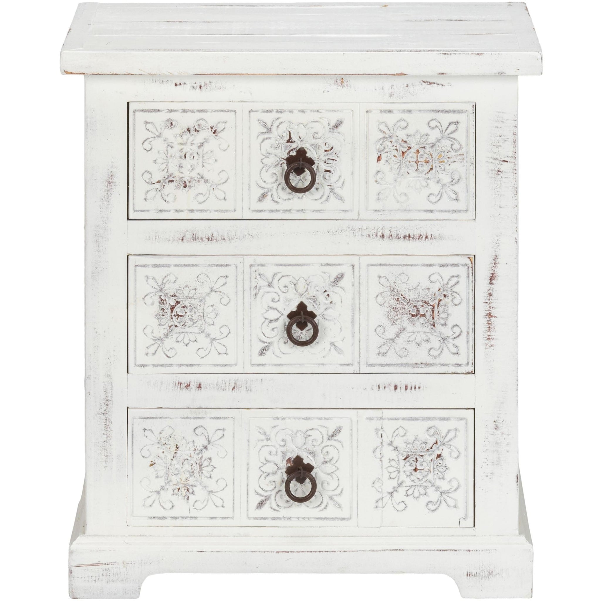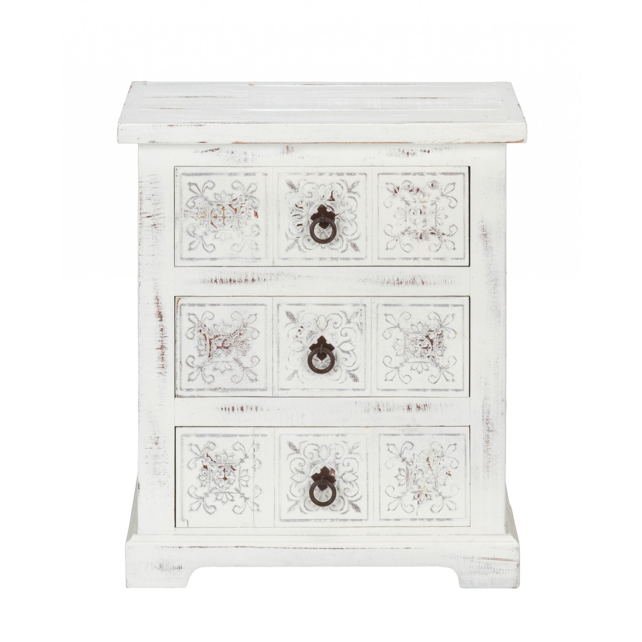 - Unconventionally artistic, the Distressed White Wooden Carved 3 Drawer Cabinet adds some character to any room in your home. Handcrafted from solid wood in a washed out distressed white finish, the cabinet flaunts beautiful hand carving details along the front. It comprises of 3 large drawers providing an ample amount of storage space. Metal loop pull handles and metal drawer guides, support the opening and closing of the drawers. The Bohemian inspired carvings of this piece emanates a calm and peaceful vibe, qualities of a perfect night stand. 26" x 22" x 15"