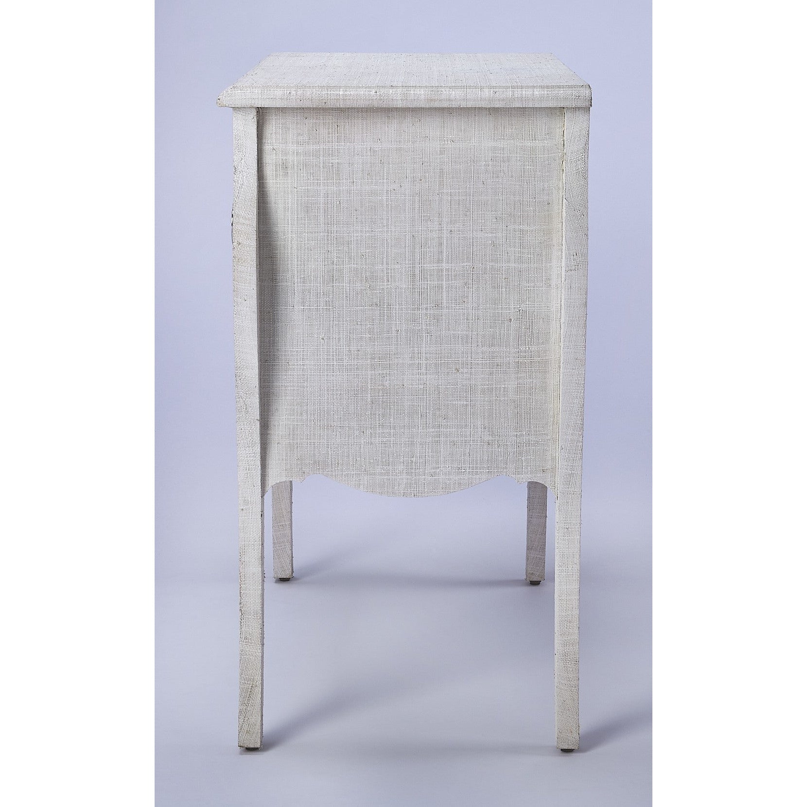 - Bring a touch of feminine styling to the master suite or living room with this lovely accent chest. Crafted from wood solids and wood products and wrapped in White Raffia, coastal ambiance is blended together with the classic styling of a bombe chest. Two storage drawers are accentuated by silver finished aluminum butterfly drawer pulls.
