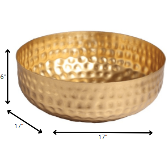 - The traditionally designed Gold Colored Round Hammered Bowl is given a modern update to be a timeless piece that fits well in your kitchen while upholding the aesthetics of your contemporary interior. Showing off a luxurious gold finish with hammered textures, this metal bowl stands out of the ordinary in a gorgeous sheen. An ideal choice to serve food on the dining table or display as a decorative accent on the living space, this visually intriguing bowl will make a bold statement anywhere you place it. Emanating an opulent essence in looks and color, this metal bowl will be a great addition to emphasize your taste of classic styling with a touch of modern flair. 6” x 17” x 17”