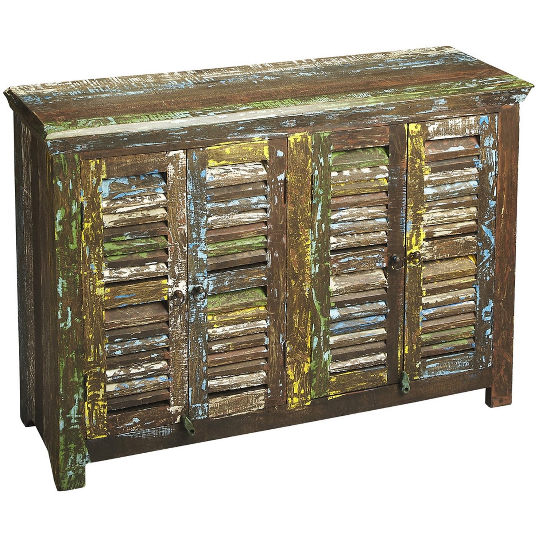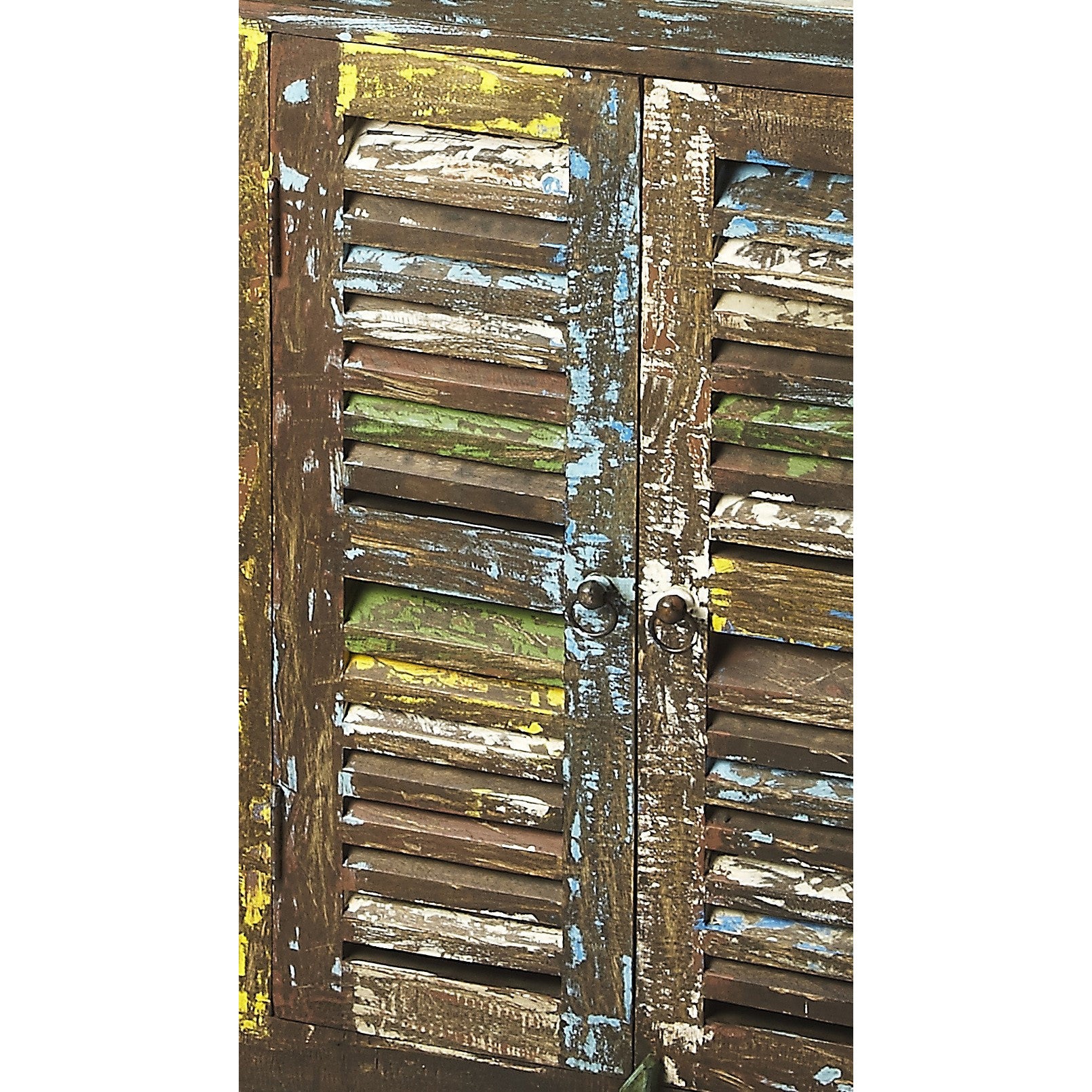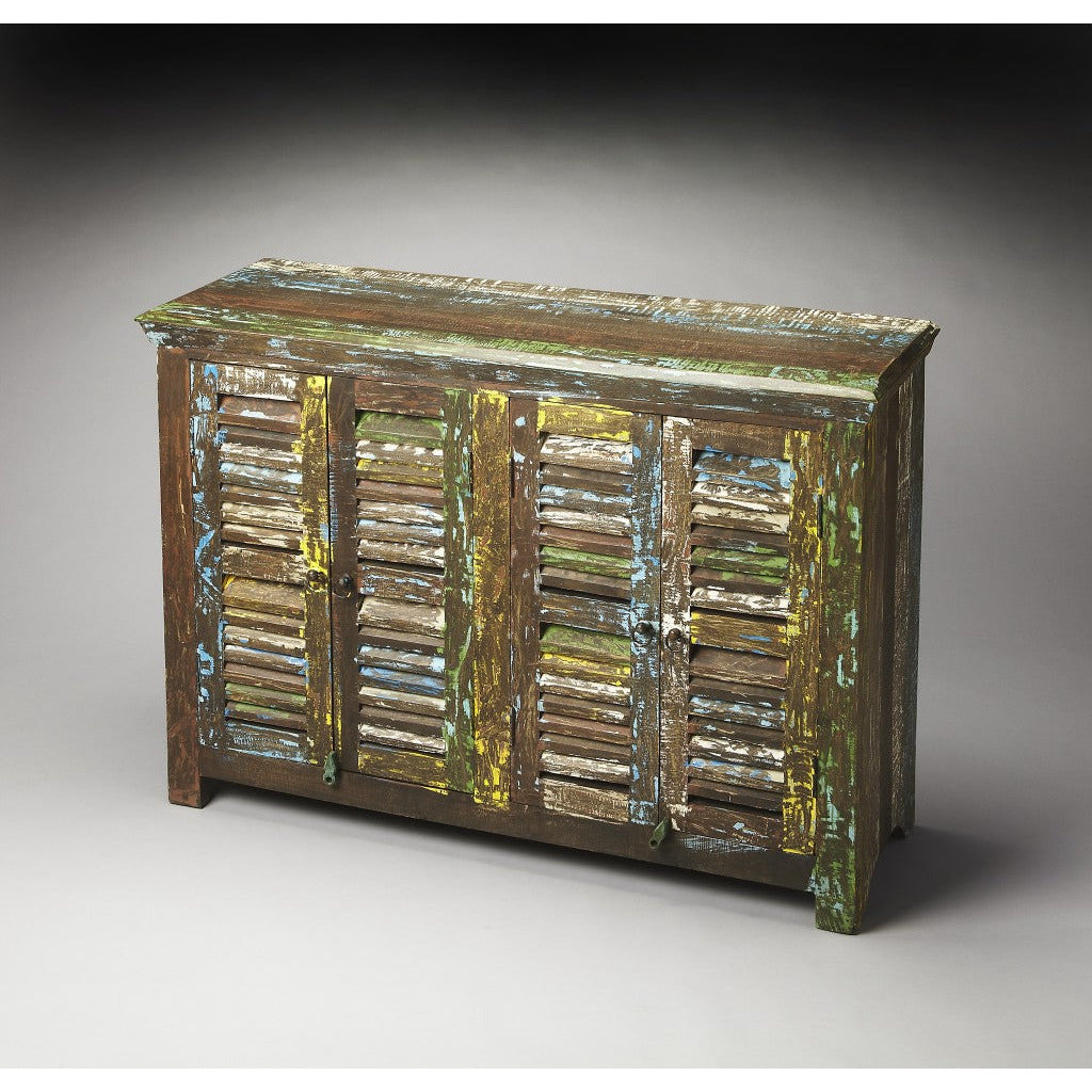 - Add a touch of color to your space with the Haveli sideboard. Behind the reclaimed mango wood shutter doors is ample storage to tuck away anything you might need. The heavily distressed painted finish adds interest, texture and a sense of history.