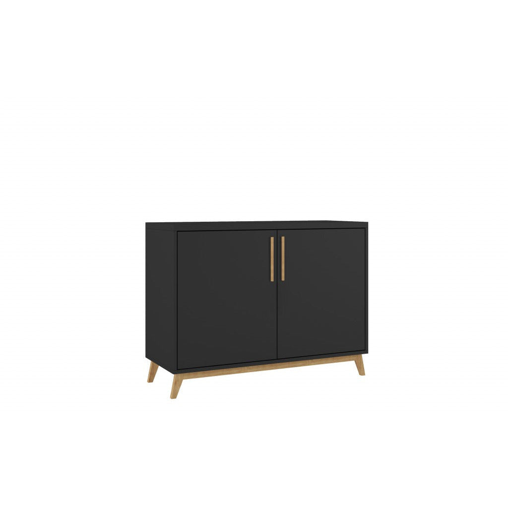 - There are so many uses for this versatile piece of furniture - Buffet Server, TV Stand, Accent Cabinet, Console Table, Sofa Table and more. The Modern Black and Natural Two Door Buffet Table can easily be used in dining room, office, home office, living room, bedroom, hallway, bathroom, and more. The clean simple design features two doors with an internal shelving that offers four spacious cubby areas to help keep everything fashionably in order. The angled flaired natural wood feet and door pulls give it a modern flair and add to the design appeal of this super practical and versatile item cabinet. 27"x35"x14