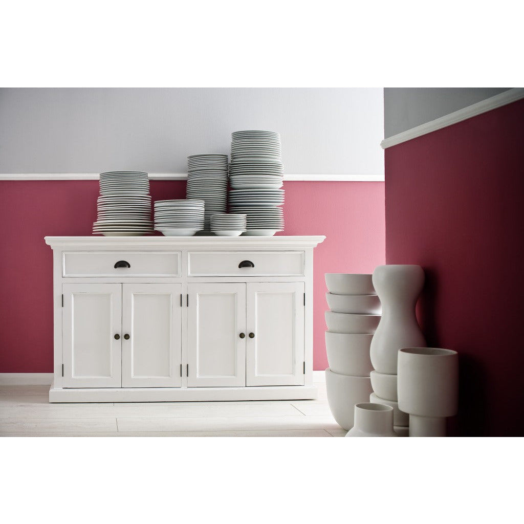 - If a stylishly charming and fresh design is what you are going for, then this Modern Farmhouse White Buffet Server will wow you with its simple but classy design lines. This buffet server has been made with the highest quality mahogany MDF and skillfully finished with smooth white paint by expert craftsmen. It has two drawers with black knobs and two doors with internal shelving & black knobs and hinges on the outside. The black knobs and the hinges compliment the rest of the all-white design perfectly and it'll be perfect for use in the living room, dining area, the hallway or even in the kitchen. You can store all your houseware in the drawers and the shelves inside the doors and lean artwork against the wall on the top surface to jazz up the room. The measurements are 33.46" x 57.09" x 19.69".