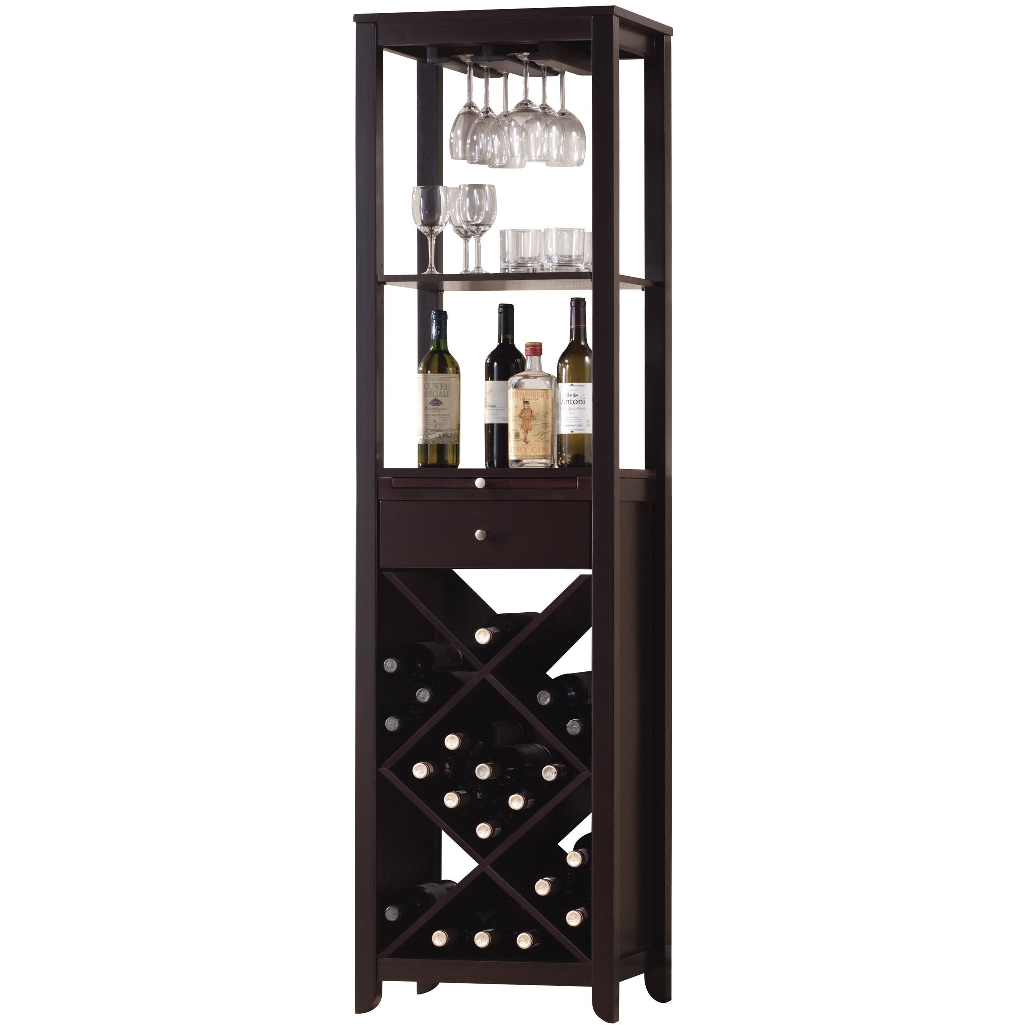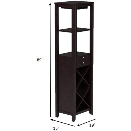 - This Modern Style Umber Finish Wood Wine Cabinet is the perfect stylish solution for storing your exclusive wine collection. Made of a mix of wood and engineered wood, the cabinet ensures strength durability. It beautifully displays delicate wine glasses at the top, prized spirit bottles below, corkscrews in the drawer, and the rest of the bottles in the latticed rack at the base. In addition, the small cutting board that you can pull out will act as an ideal serving platter for cheese and hors d' oeuvres. The versatile addition is must-have to celebrate any special occasion. 69" H x 15" W x 19" D