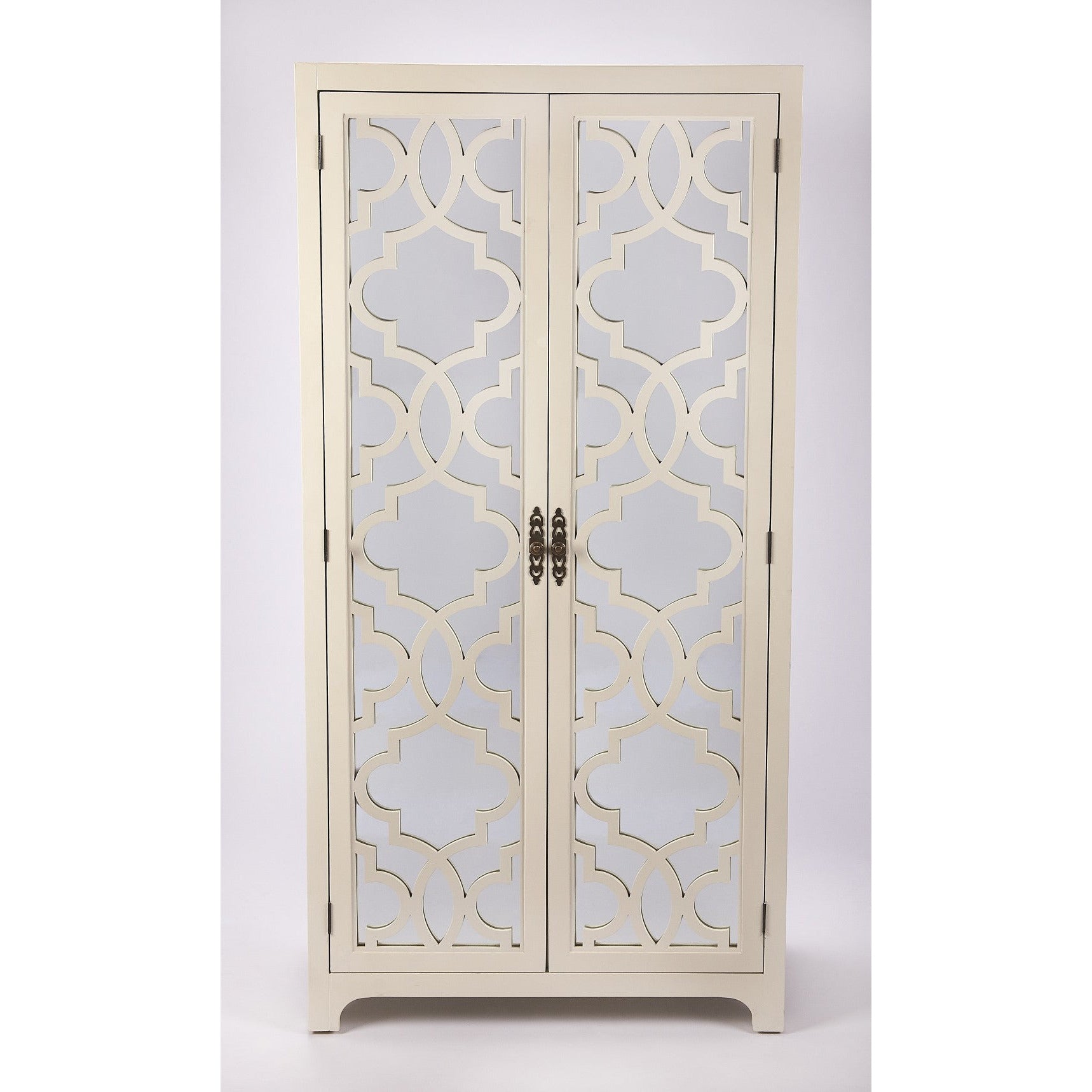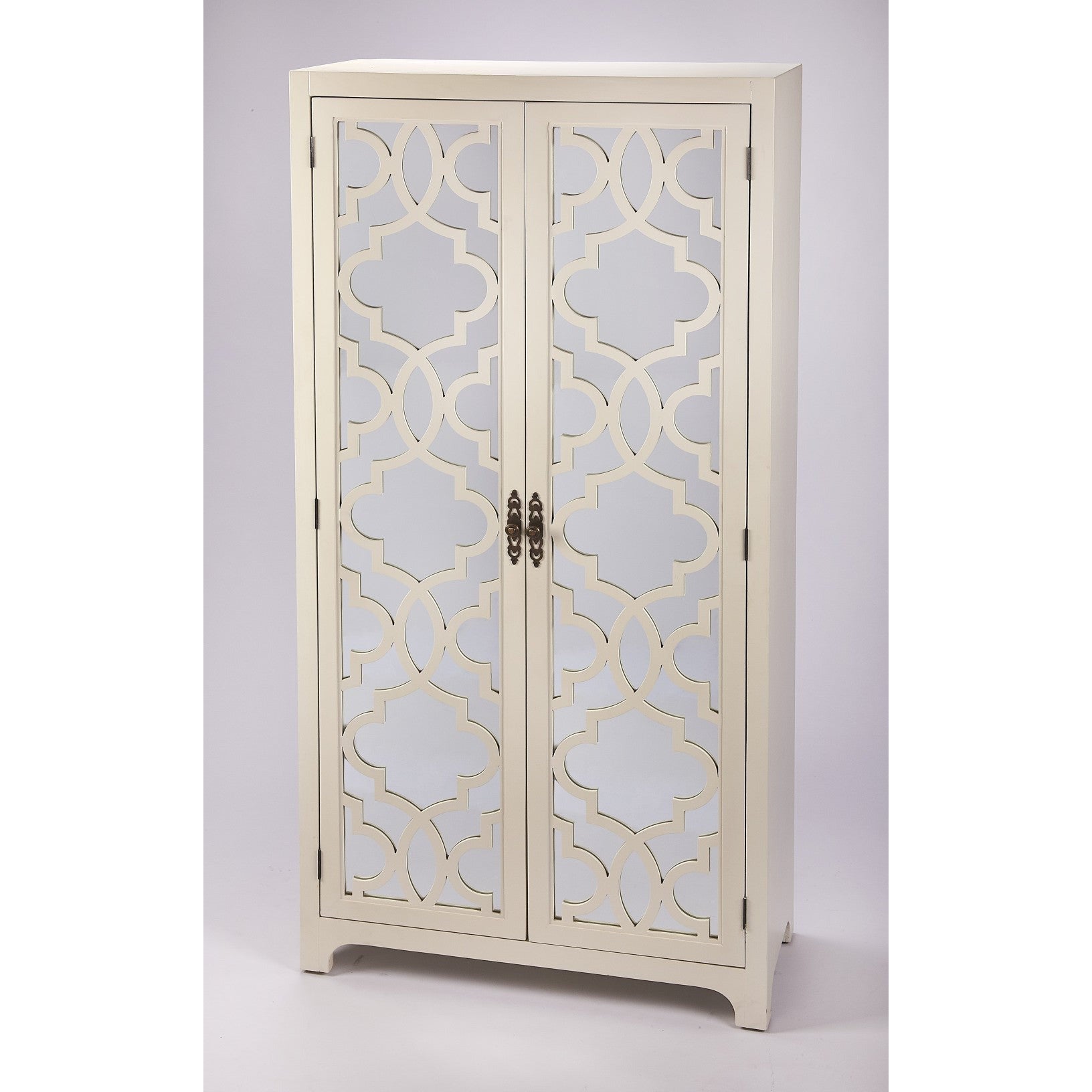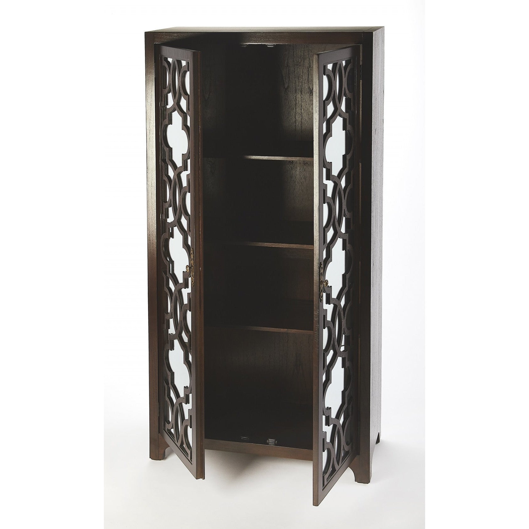 - Versatile style abounds with this clean-lined tall storage cabinet. Two top doors are adornned with glass fronts, which enclose three tiers of shelving and provides space to place your favorite accent pieces. Two bottom doors open to reveal a spot to stash towels, toiletries, cleaning supplies, and more. Thanks to its neutral hue, this craftsman style is sure to blend with any existing ensemble.