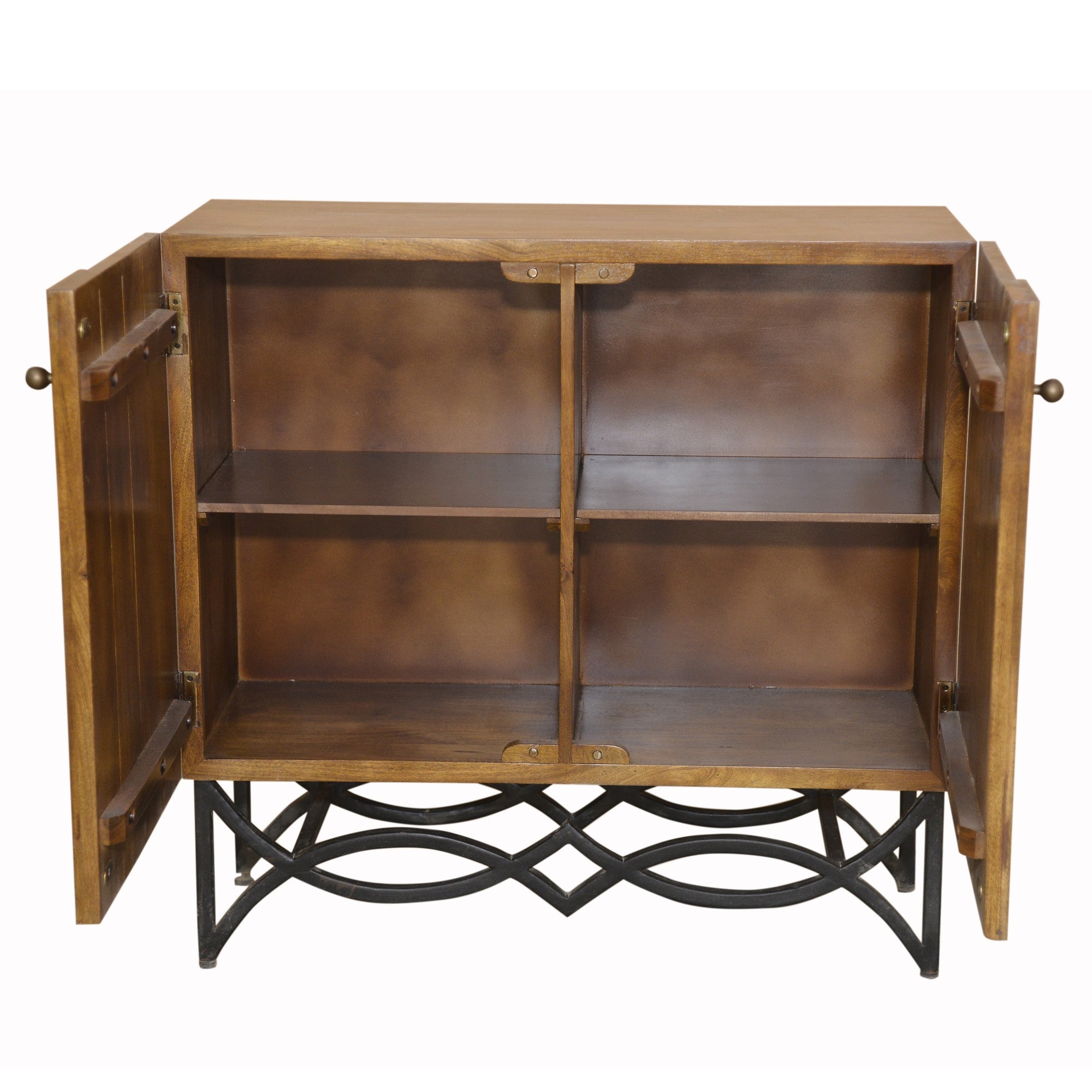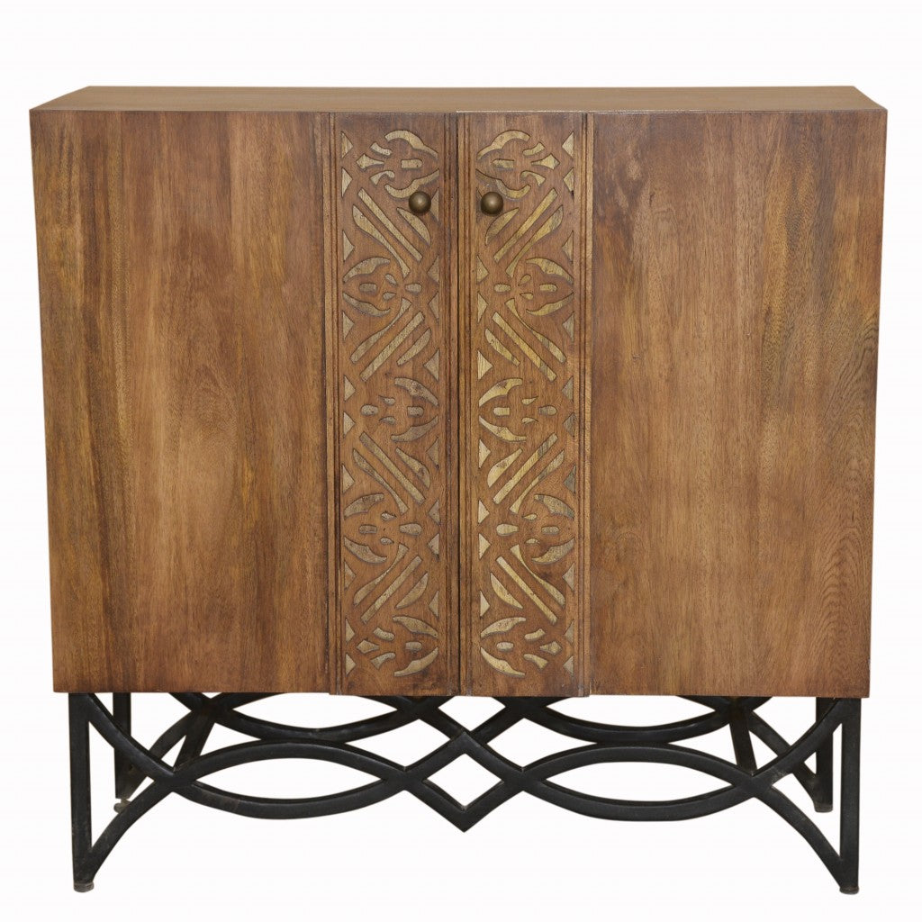 - A true form of art, the Natural Wood and Black Iron Scroll Double Door Cabinet is the perfect addition - so beaufiful and versatile it can be great as a decorative accent and storage cabinet in most any room in the house. With a handcrafted touch, the gorgeous genuine warm mango wood has elegant scrolling carved pattern running down the side of each of the doors. The genuine mango brings with it natural grains, grooves, and knots that make this piece a true treasure. The natural rustic stain with gorgeous scrolling matte black iron lattice work across the bottom all add to the beauty and uniqueness of this piece. The spacious inside compartment includes a shelf to help fight clutter and keep you organized in a most civilized and artistic way. This gorgeous cabinet would be ideal not only in living room but also a beautiful and practical storage addition to the office, bedroom, dining room, entrance hallway or bathroom area.34" x 14" x 35".