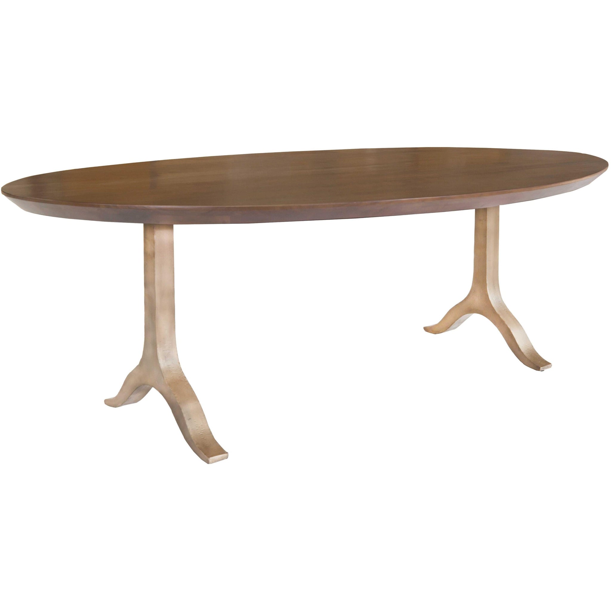 - Bring a unique centerpiece to your space with this gorgeous Oval Walnut and Antique Gold Dining Table. The rustic finish antiqued brass finish legs have an organic feel to them and bring lots of modern visual interest. The traditional solid wood walnut finish tabletop is smooth and a great size for friends and family to gather. 30" x 82" x 48".