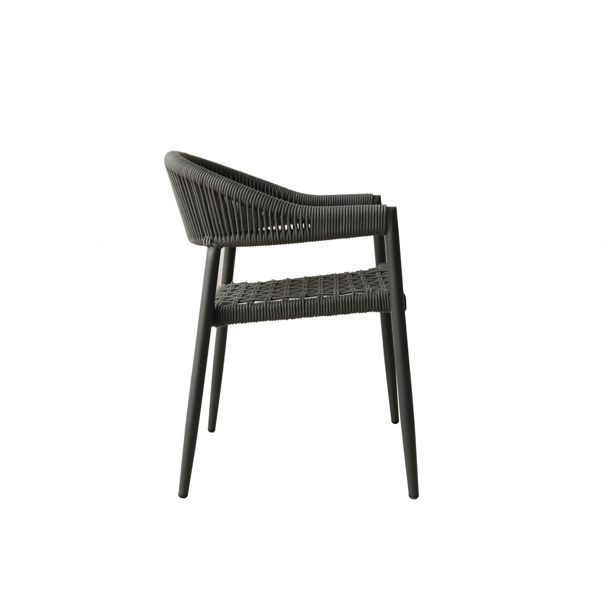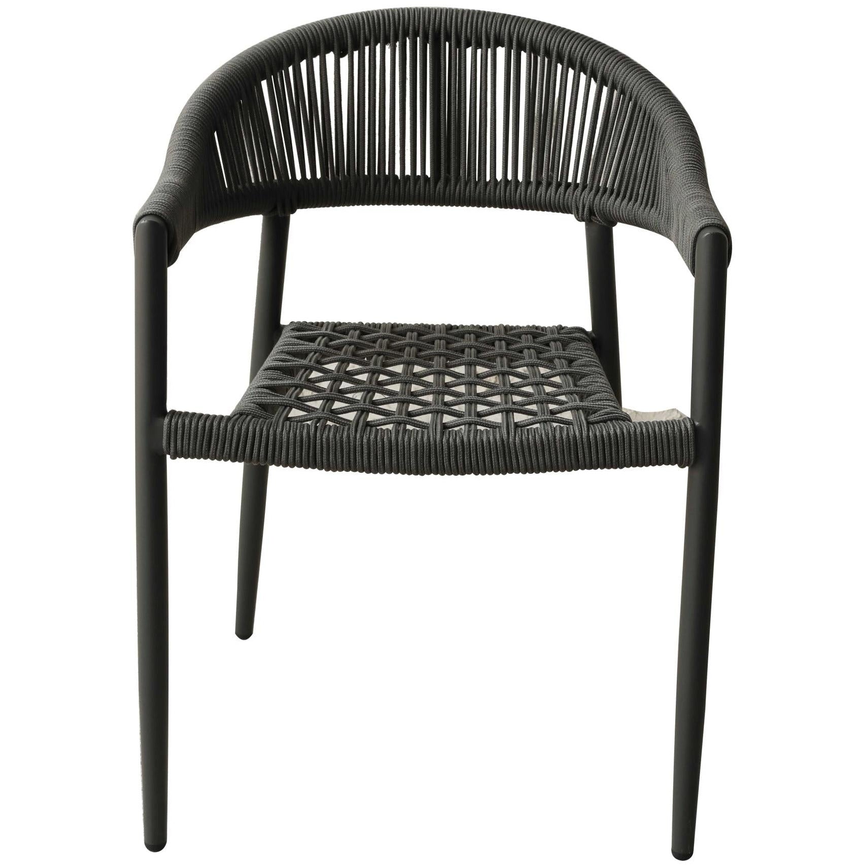 - Defined by a beautiful weave, open back design, this set of stackable patio dining chairs is a great addition to your indoor or outdoor space. Its neutral gray and weather-resistant finish lets it blend with a variety of color palettes and aesthetics, while its streamlined silhouette offers a dash of contemporary style. Crafted of dark gray aluminum and olifen rope, these chairs are a unique and contemporary choice for your arrangement. Each has a weight capacity of 350 lbs. 31" x 22" x 23" each. Set of 4