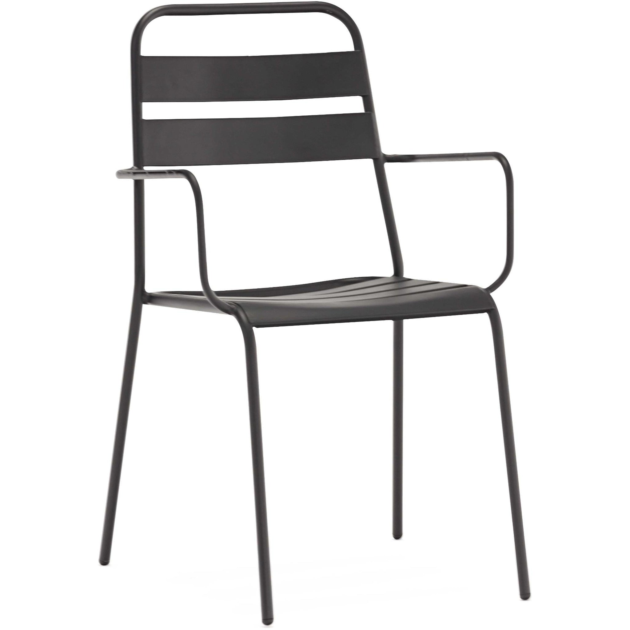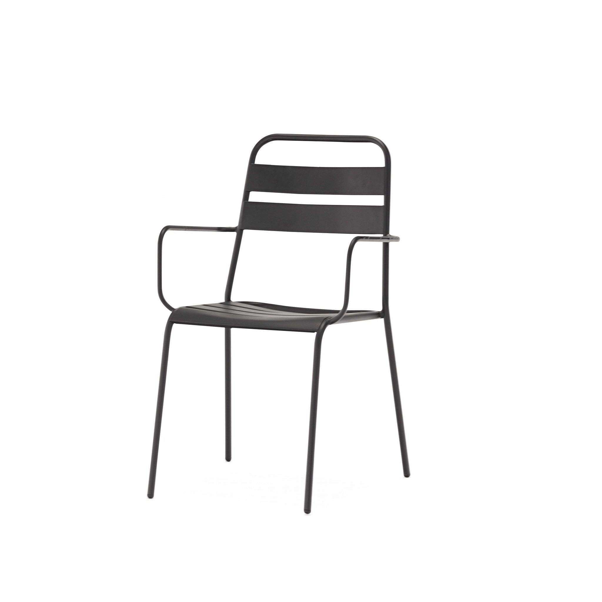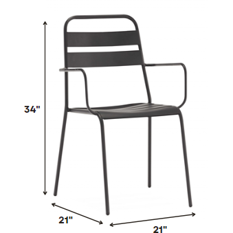 - Ideal extra seating for indoors or out, these Gray Stackable Aluminum Arm Chairs are a great addition to your space. Its contemporary style is sure to disrupt dullness and uniformity. This dining armchair is a high quality piece and is perfect for those who want to brighten the ambiance of their place. As for measurements, they're 34" for height, 21" for width, and 21" for depth, and it weighs 42 pounds. Set of 4.