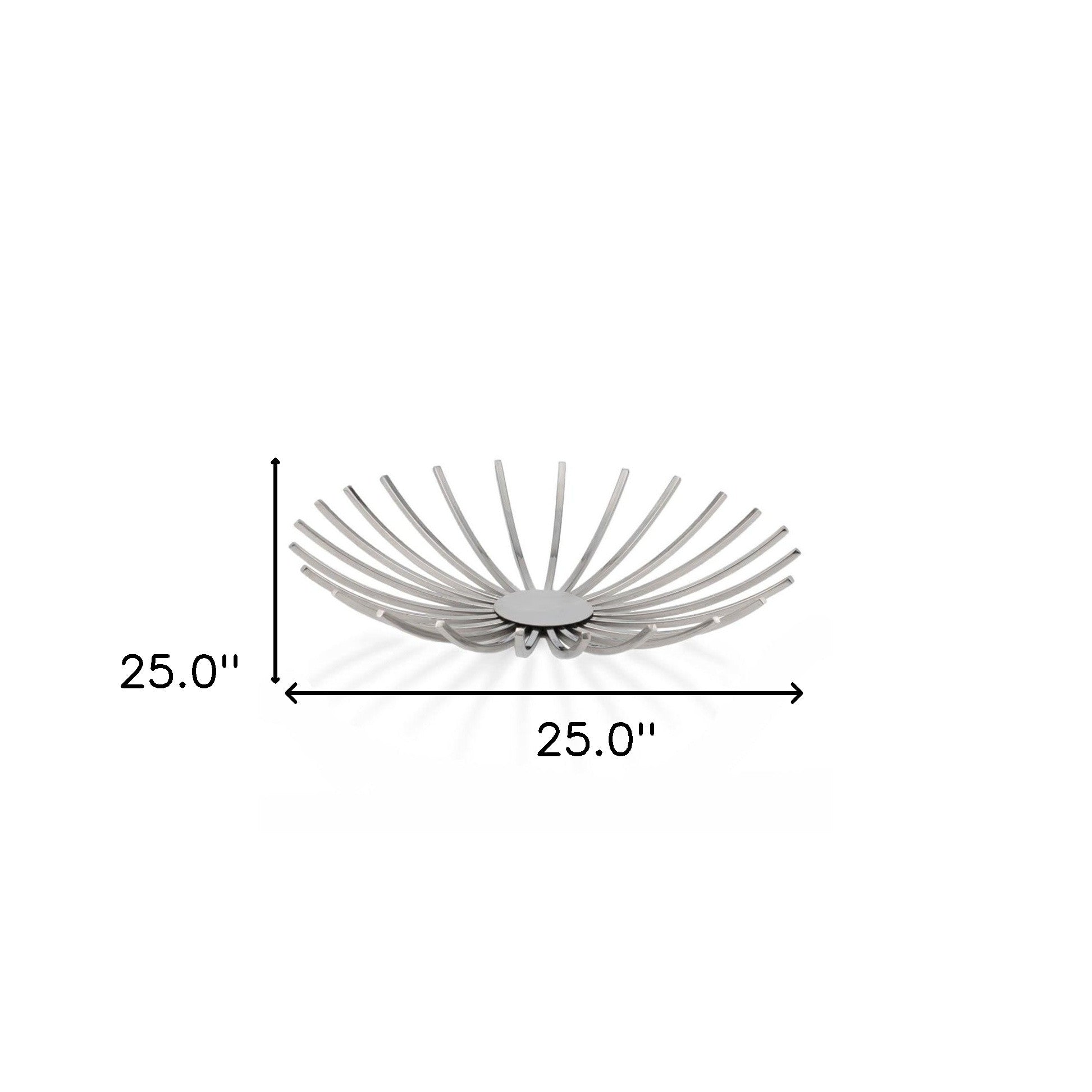 - The Shiny Silver Open Spike Centerpiece Bowl will be a truly unique addition to your space. Spanning more than two feet across, this massive bowl is made of stainless steel and has an open prong design that will bring a contemporary and slightly edgy vibe to the room. A great centerpiece option, this low bowl would look fabulous on your dining table, coffee table, counter or large bookshelf. 4" x 25" x 25".