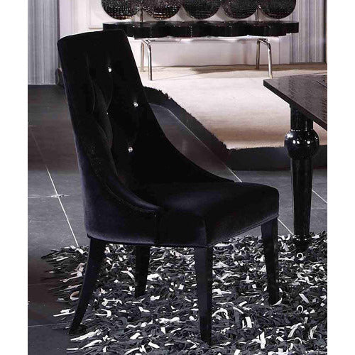 - Get yourself a piece that has both gorgeous appearance and superb functionality with this dining chair. This dining chair is a superbly made piece, which has a black velour upholstery and wood legs. Its certainly both sturdy and durable. As for measurements, they are 40 for height, 23 for width, and 25 for depth, and it weighs 56.4 pounds. This dining chair can be a great addition to your home and will improve its ambiance immensely. If you want a functional, gorgeous, and durable dining chair, this is the one for you. This is a set of two.