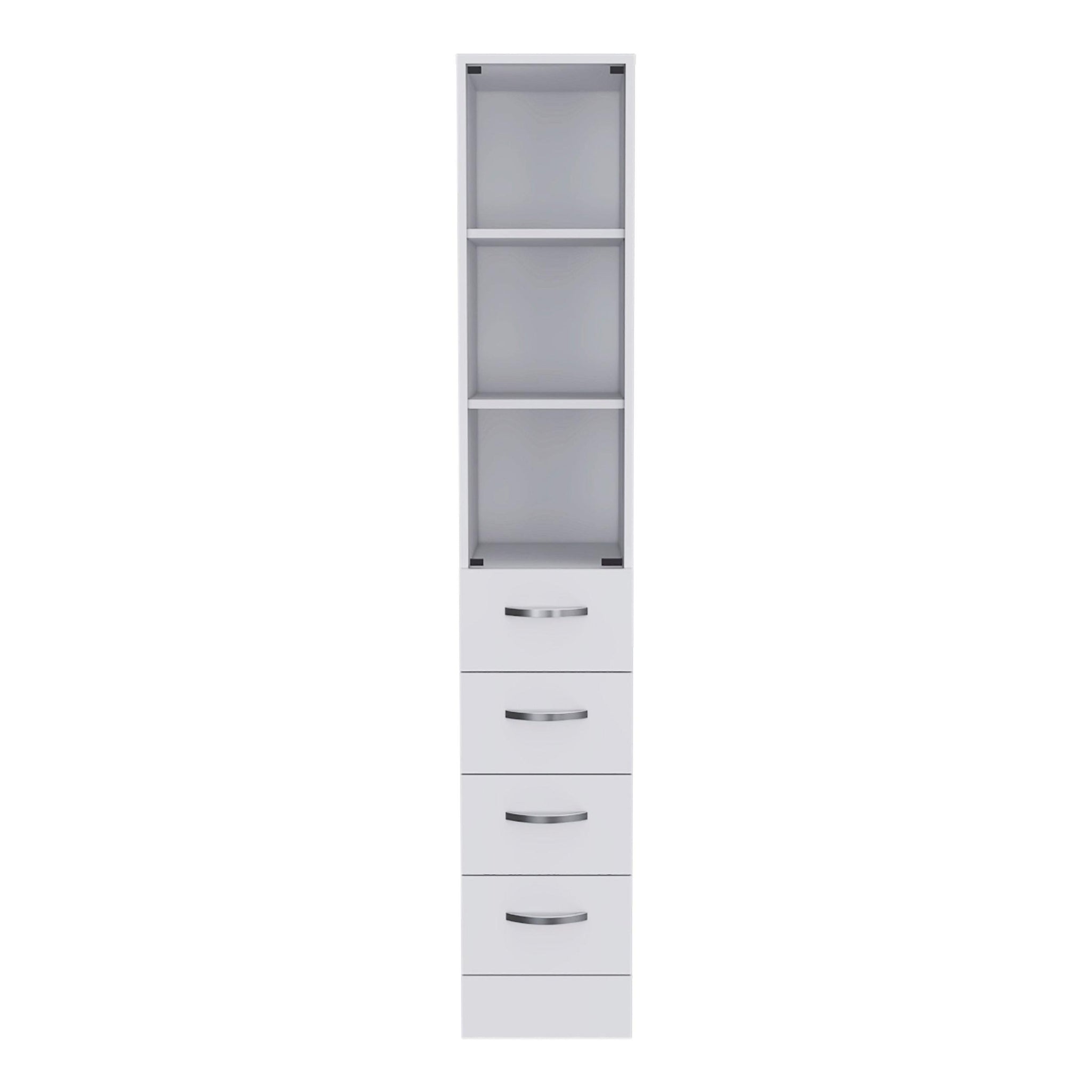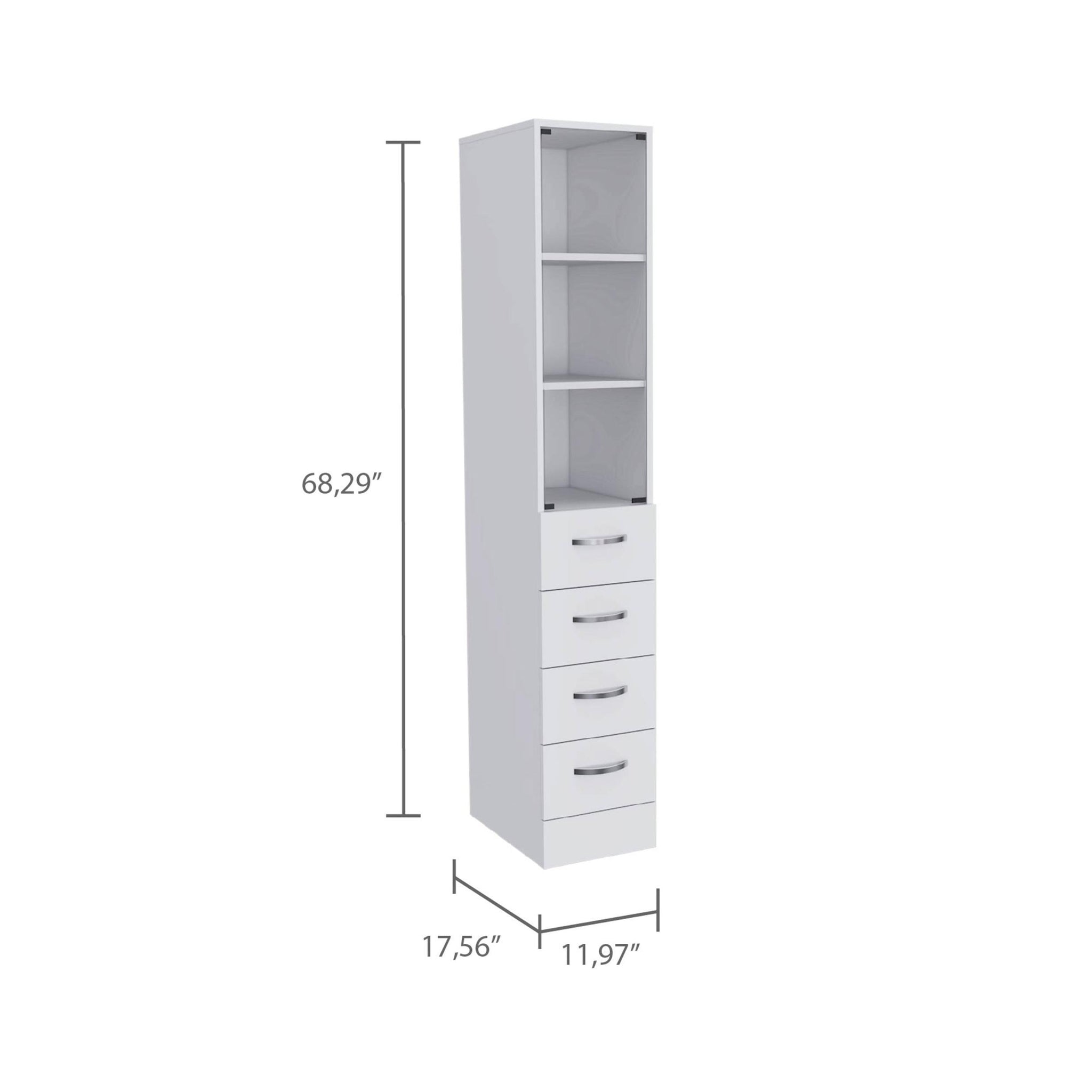 - Modernize your bathroom with an additional piece of contemporary design that is very useful for extra storage space, with our White Bathroom Cabinet with Glass Door and Sliding Drawers. The white color design visually gives a feel of cleanliness and harmony in your space. The spacious three upper shelves with a glass door give a luxury feel and for essential storage of your toiletries essentials. While the four spacious sliding drawers are for quick access to your linens like towels, bathrobes, wash apparel, and other essential linens that you regularly need. You can also use this versatile stylish cabinet in your utility, living room, or anywhere you need it. Crafted from durable particleboard which is perfectly designed to resist moisture and humidity, to provide your space tough storage that will last. Improve your space’s current look with this functional savvy piece with style, to help you organize your space better and avoid digging around constantly for your things. 68.29” X 11.97” X 17.56”