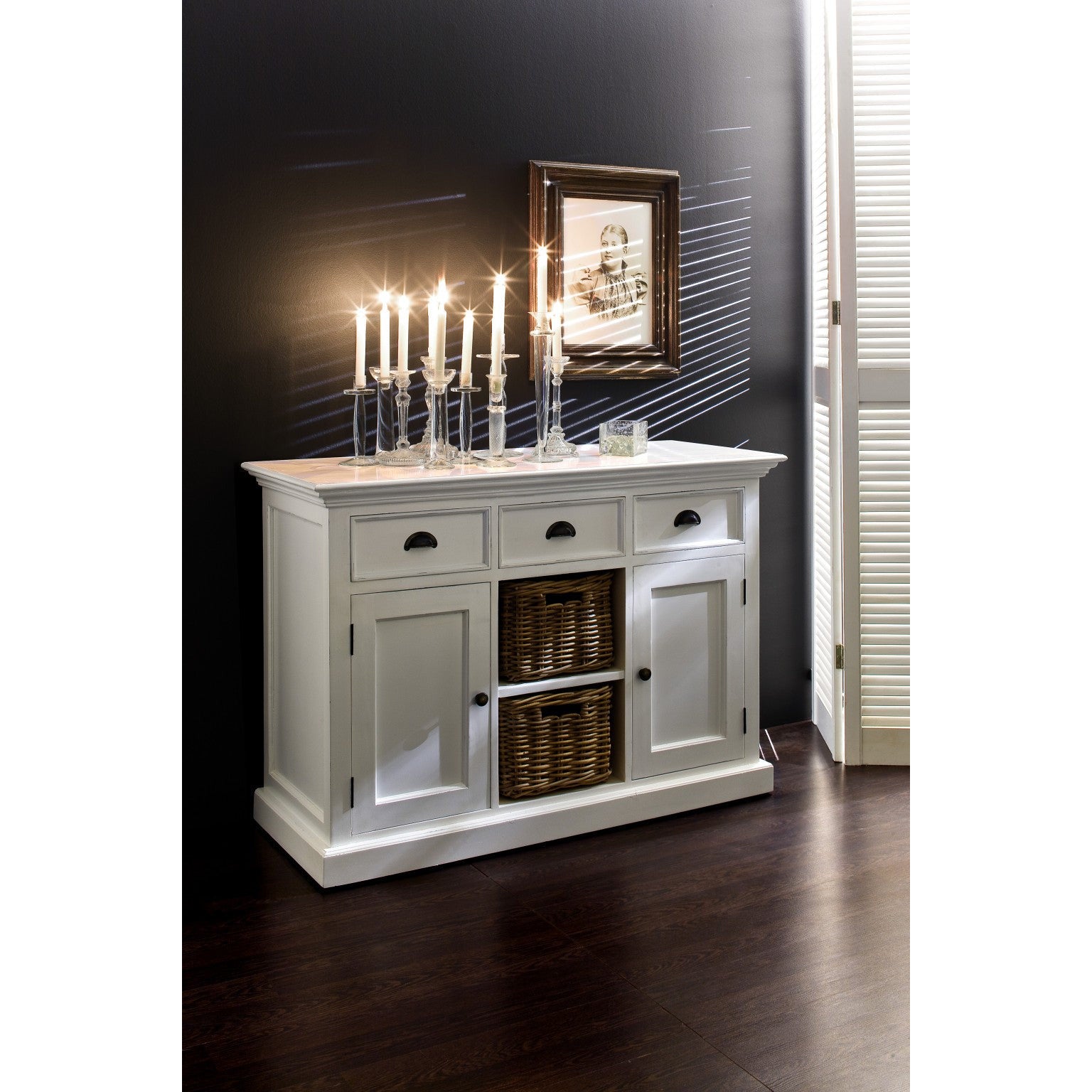 - If you are looking for the ultimate versatile cabinet with different storage options, then this White Modern Farmhouse Large Accent Cabinet with Baskets is just perfect for you. A clean gorgeous white finish with crown molding style edging, this cabinet is a gorgeous, practical and sturdy piece of furniture. The cabinet has three easy pull out drawers with black cresecent pulls and ample storage space. Below them, are two doors with black knobs on either side of the cabinet that keep more additional storage space covered, including a shelf. The center section of this piece includes open shelving that is filled with two removable rattan baskets with cut out handles. Suitable for just about any room in the house, the ample storage gives you updated and stress-free storing options that would be great as a buffet server and storer in the living room but could also be great in the bedroom, home office, kitchen, or large bathroom. The measurements are 33.46" x 49.21" x 19.69".